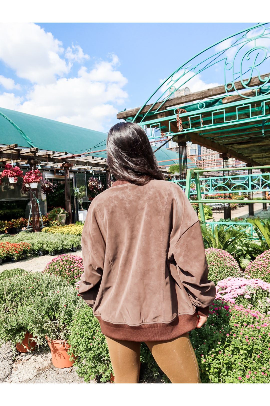 A varsity-style jacket... but make it chic. The Alfie Jacket by Line & Dot brings a relaxed, oversized fit to a rich chocolate faux suede finish—serving major fall energy with a side of cool-girl effortlessness. Ribbed knit cuffs and snap buttons keep the look structured while the slouchy shape lets you layer it over tees, knits, or even dresses. This one’s giving “I borrowed it from the boys but made it better.”