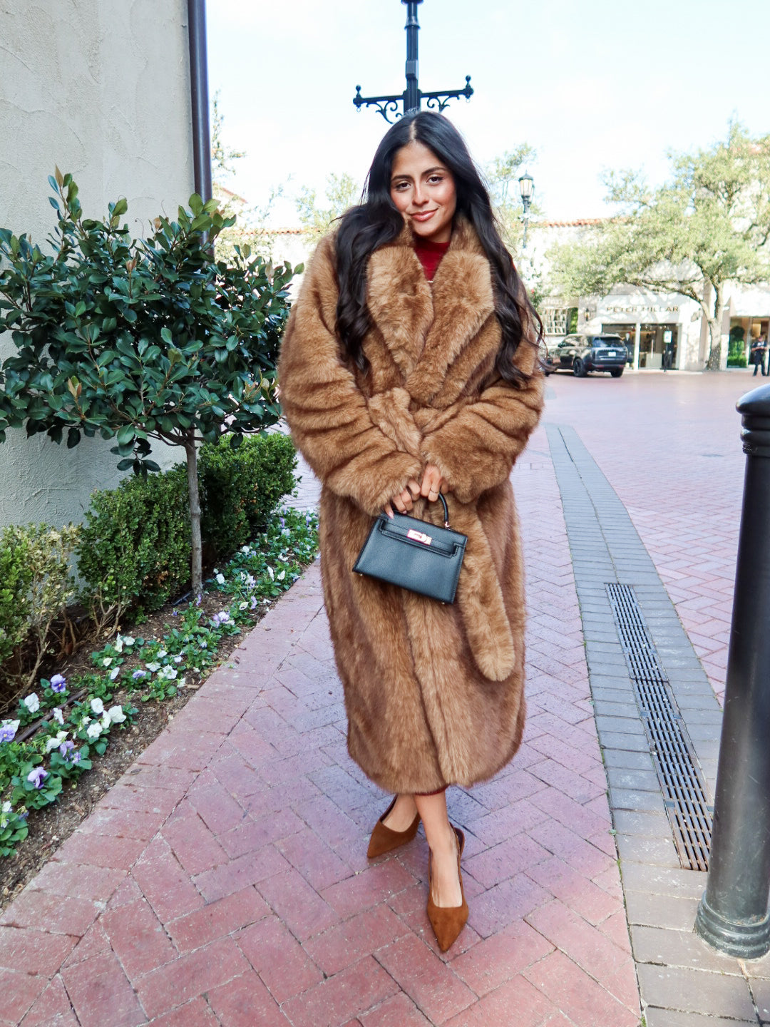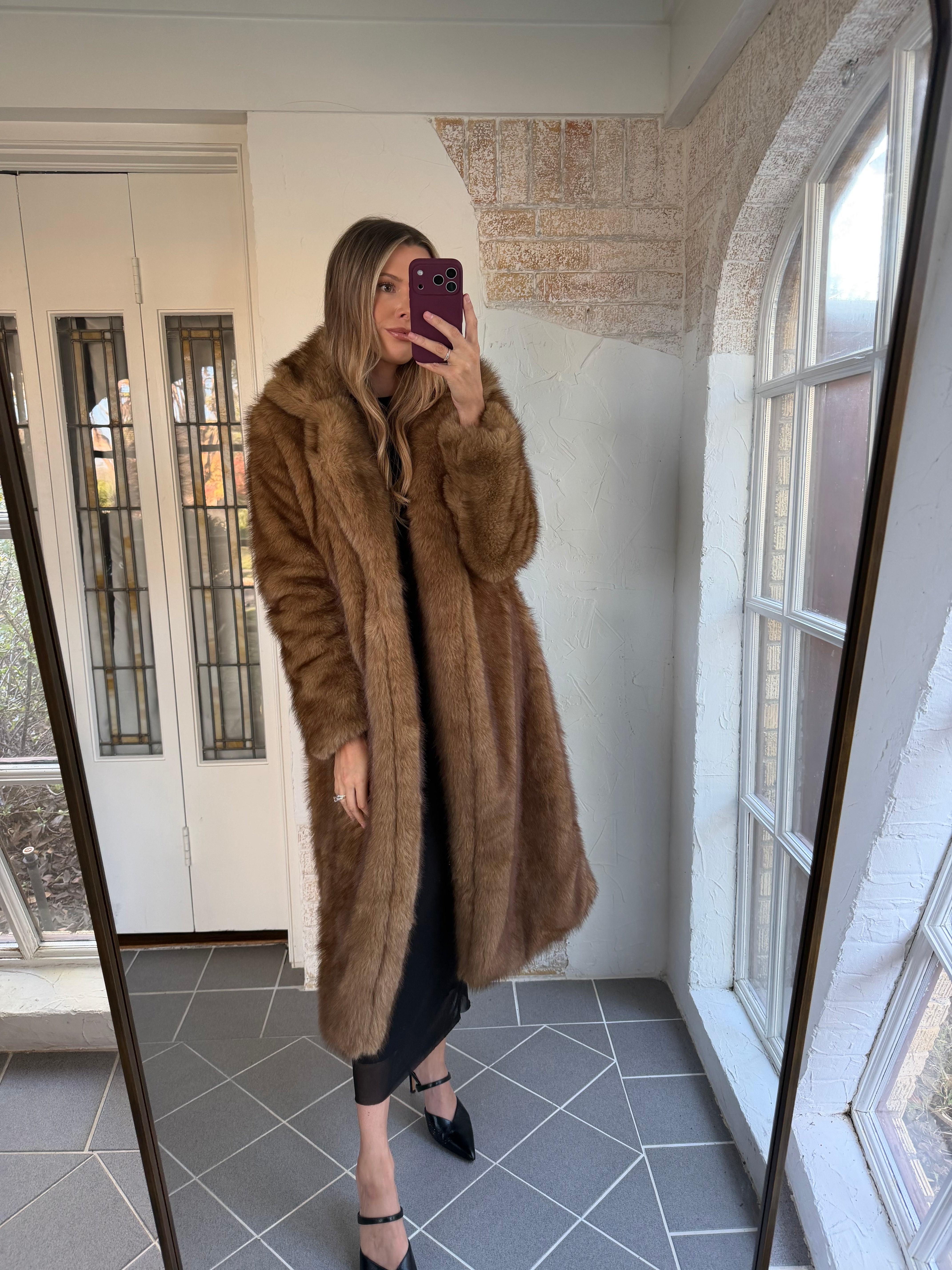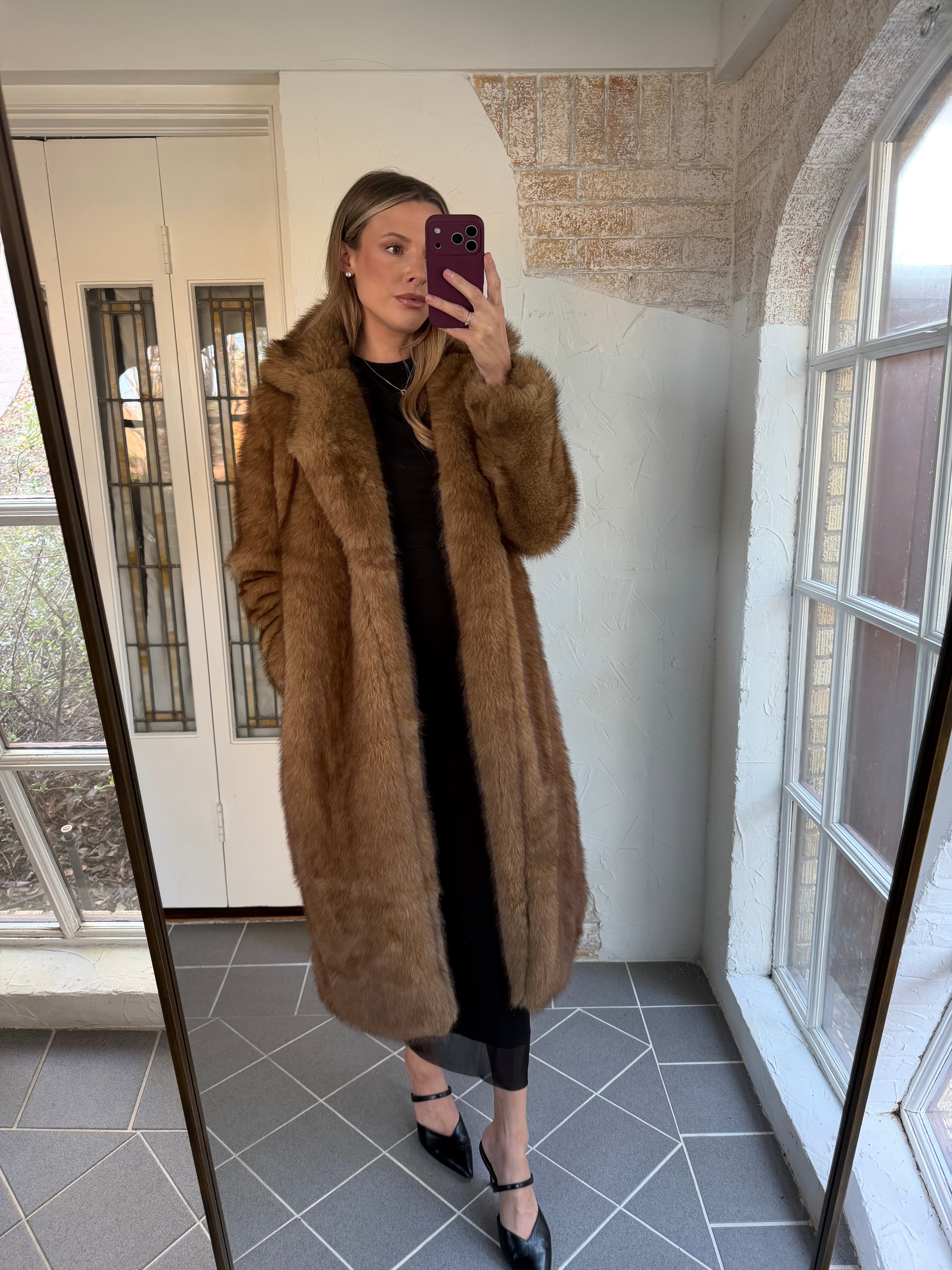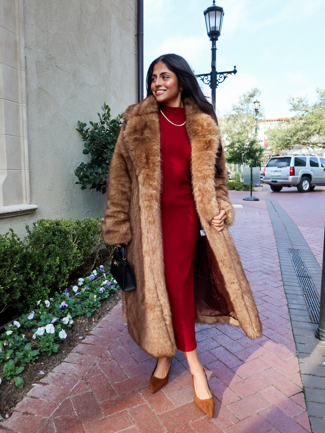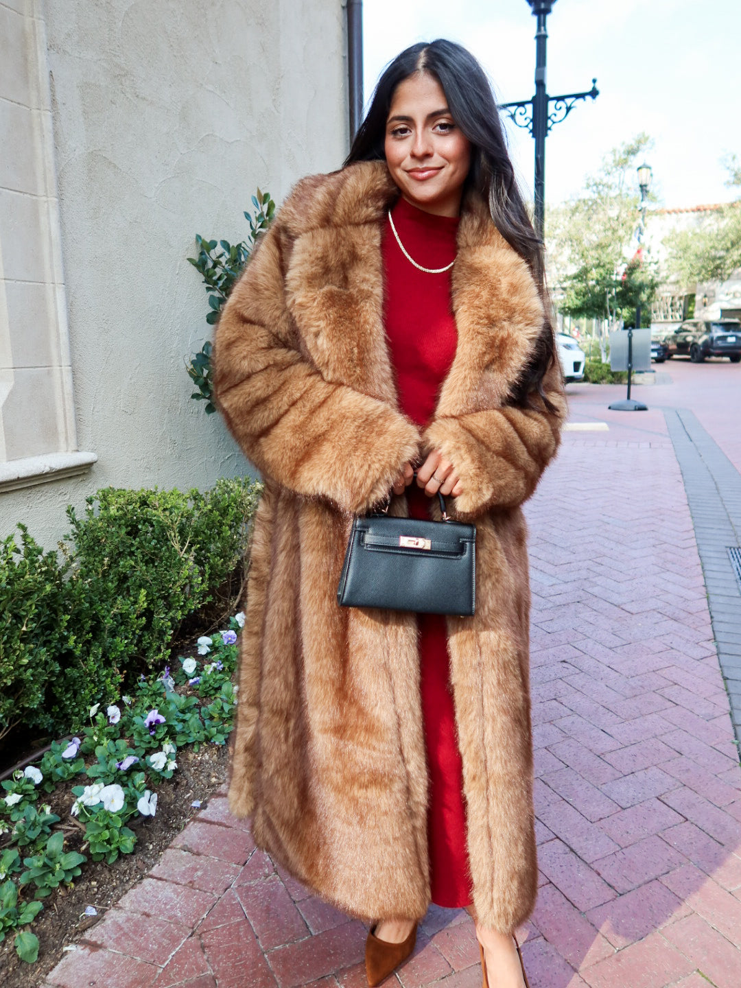 Cozy glamour, coming right up. The Fur the Moment Coat wraps you in ultra-soft faux fur with a rich walnut hue that instantly elevates any outfit. With its longline silhouette and plush texture, this is the throw-on-and-look-expensive layer your winter wardrobe has been waiting for.