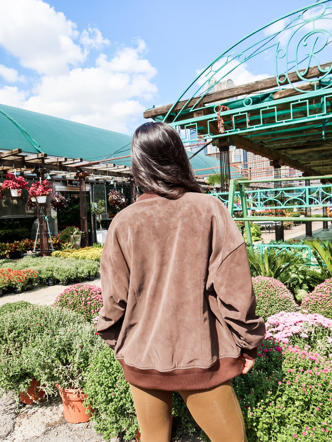 A varsity-style jacket... but make it chic. The Alfie Jacket by Line & Dot brings a relaxed, oversized fit to a rich chocolate faux suede finish—serving major fall energy with a side of cool-girl effortlessness. Ribbed knit cuffs and snap buttons keep the look structured while the slouchy shape lets you layer it over tees, knits, or even dresses. This one’s giving “I borrowed it from the boys but made it better.”