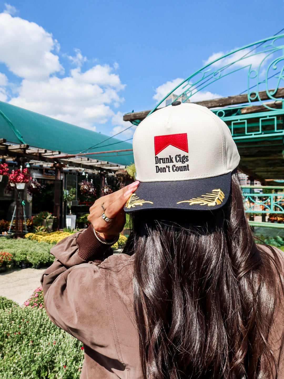 – “Drunk Cigs Don’t Count” embroidered front and center (because they don’t)