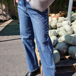 Make way for your new favorite statement denim. The Rebel Hour Studded Jean by Just Black Denim brings the edge with silver stud detailing and a slouchy, low-rise fit that’s giving total off-duty energy. Made from a rich dark wash with subtle fading, this pair keeps things laid-back but far from boring.