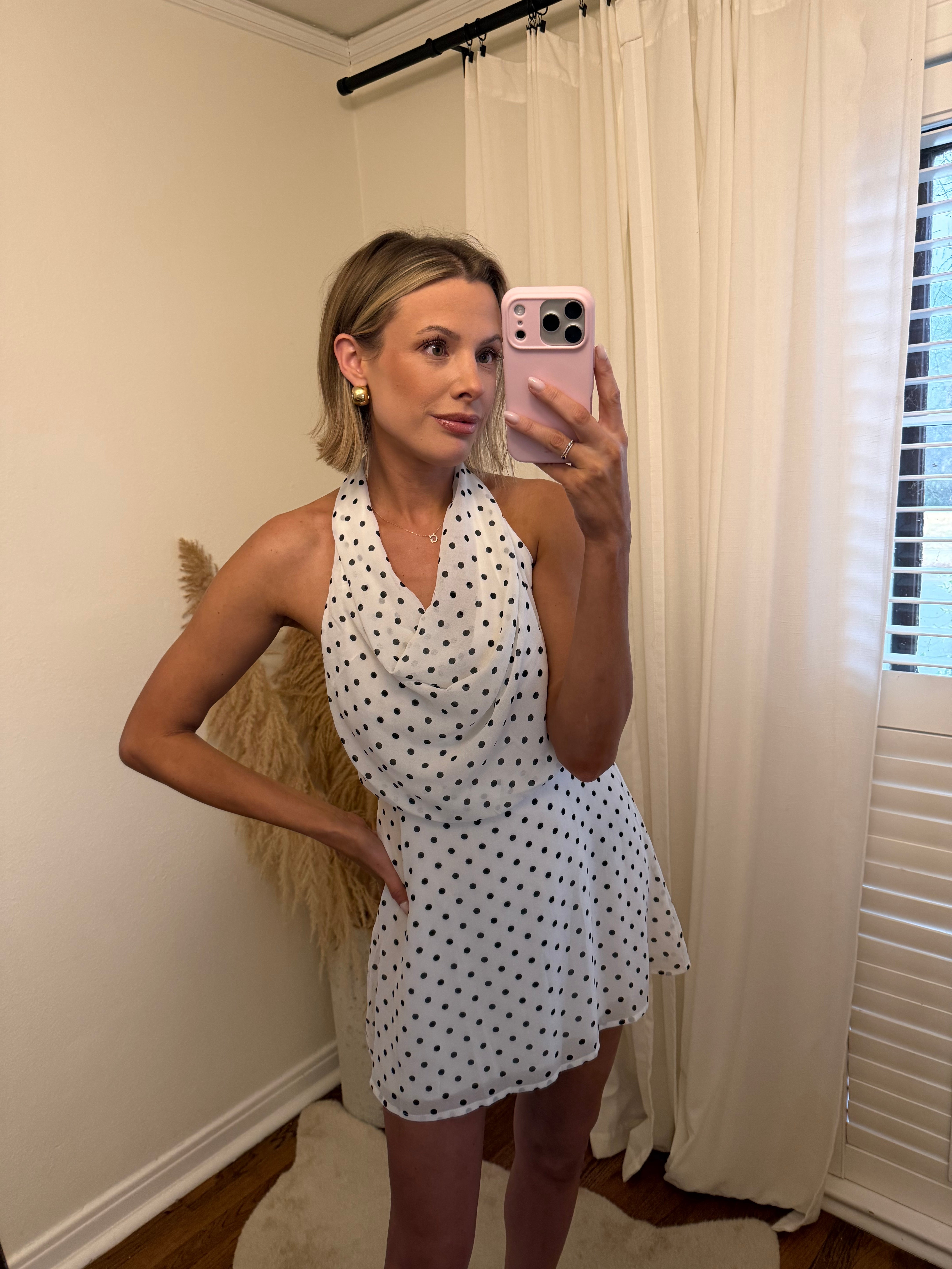 A little retro, a lot irresistible. The Seeing Spots Mini Dress features a classic black-and-white polka dot print with a soft draped halter neckline and an open back that brings just the right amount of drama. Lightweight and flowy, this mini is made for warm nights, rooftop cocktails, and spontaneous plans.