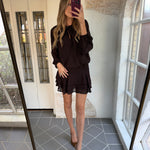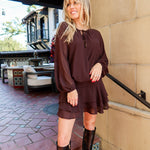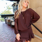 Flirty, flowy, and so flattering. The Brown Sugar Mini Dress is designed in airy brown chiffon with a surplice neckline, relaxed drop waist, and bubbled sleeves for a perfectly feminine finish. It’s lightweight, romantic, and ready for all your fall occasions.