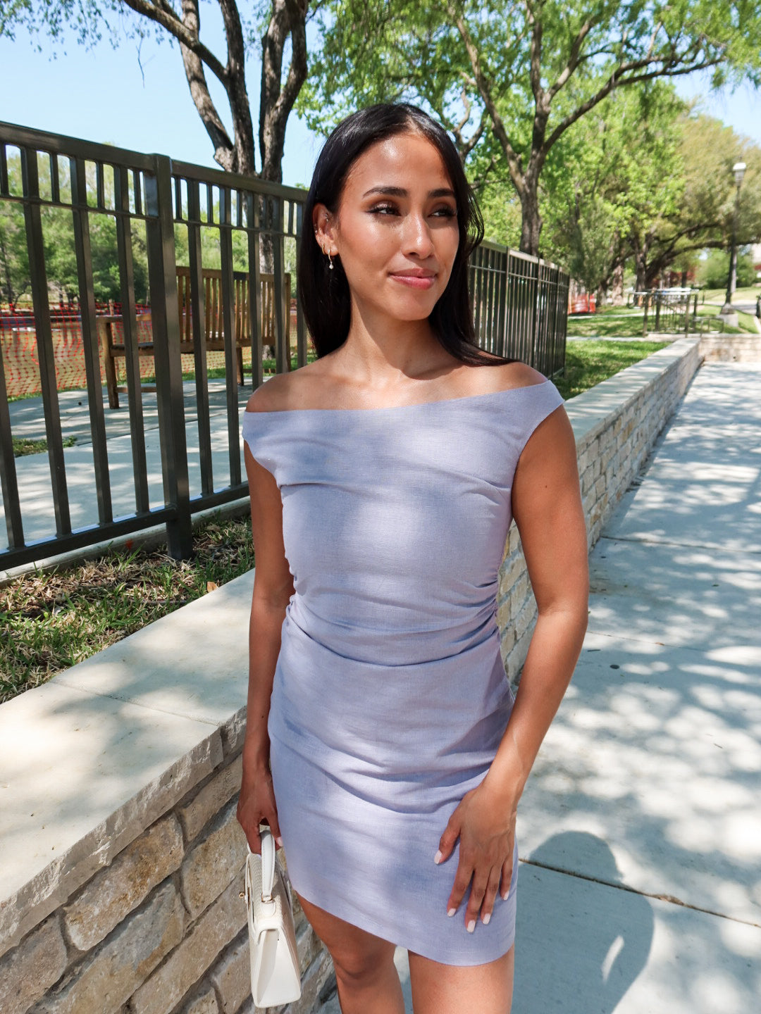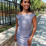 Sleek, sculpted, and effortlessly flattering. The Stillwater Mini Dress features a soft gray-blue wash in a modern silhouette that hugs in all the right places. Designed with an asymmetric draped shoulder and subtle pleating along the sides, this mini creates beautiful shape while keeping the look polished and refined.