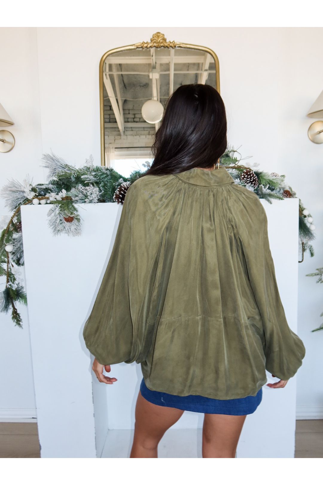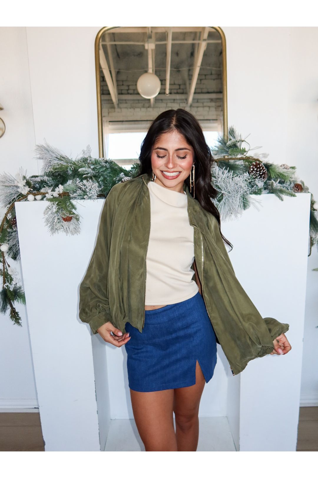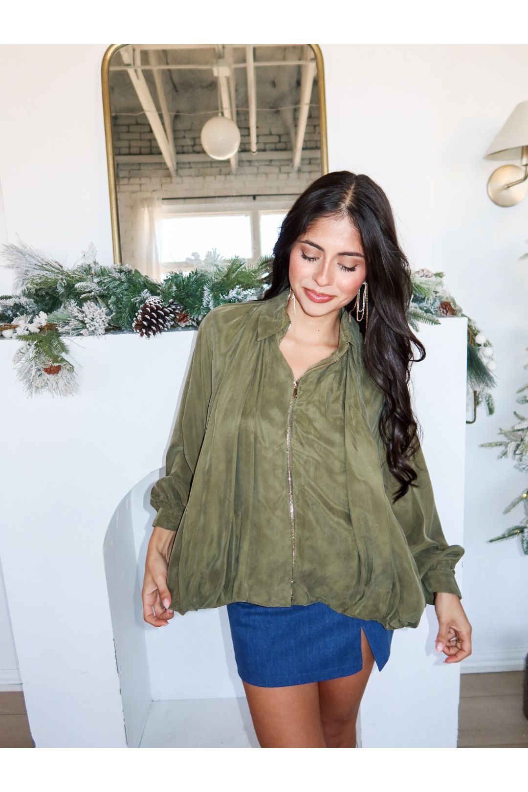 Cropped, pleated, and ready to turn heads—the Green Light Jacket is your shortcut to effortlessly cool. With a trendy bubble silhouette, gold zipper detailing, and luxe drape (thanks to 100% viscose), this little number brings big fashion energy in a perfectly understated olive hue. It’s the jacket that says, “I’m on trend… but not trying too hard.”