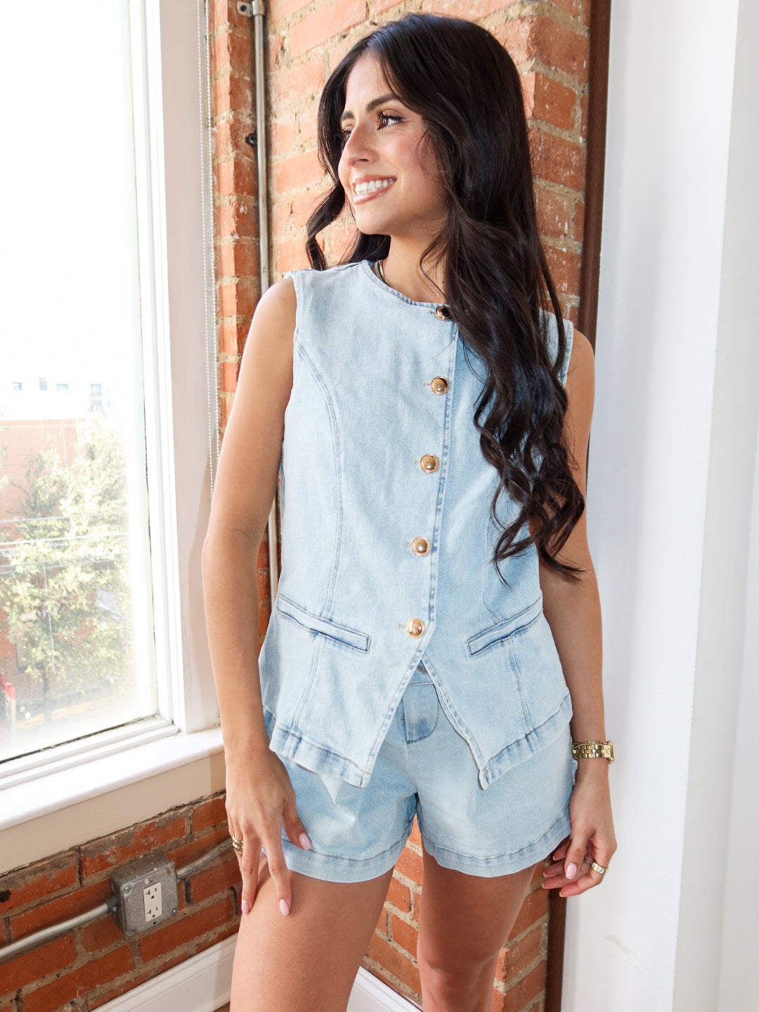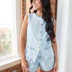 Easy, sunny, and made for daytime plans. The Blue Skies Denim Set features a super-soft light-wash denim vest with chic gold button detailing, paired with matching relaxed-fit denim shorts. Polished enough to feel styled but comfortable enough for all-day wear, this set is perfect for picnics, baseball games, weekend strolls, and every casual plan in between.