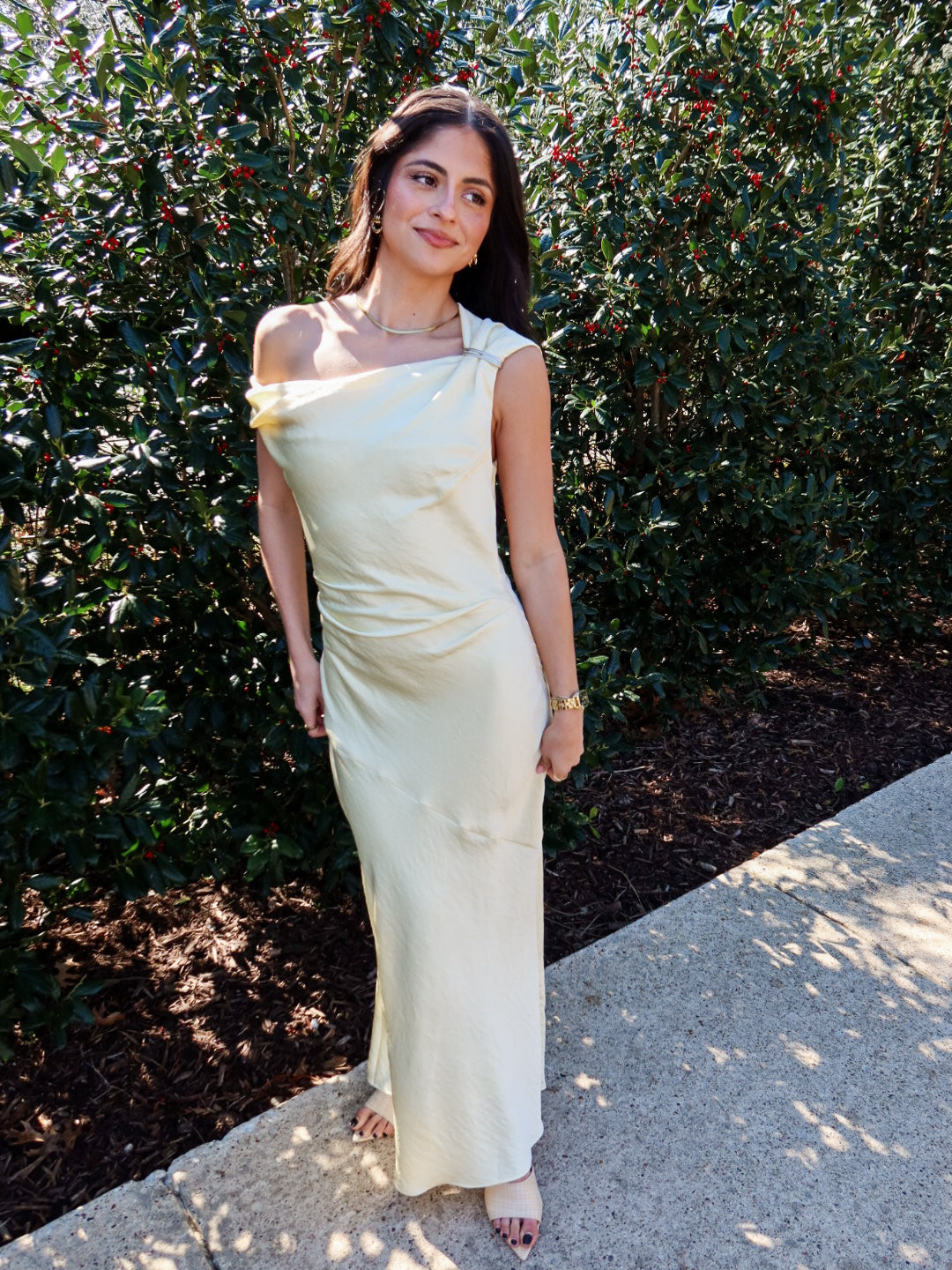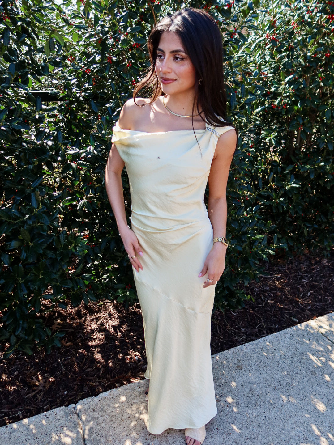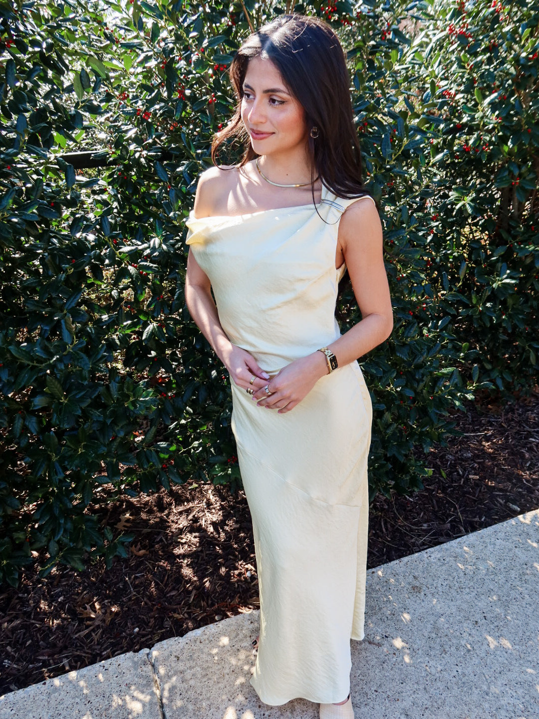 Effortless elegance at its finest. The Hiedra Dress is a stunning butter yellow silk maxi designed to drape beautifully over the body with a loose, flowing silhouette that’s incredibly flattering. Finished with a sleek silver metal decal on one shoulder, this dress strikes the perfect balance between minimal and statement.