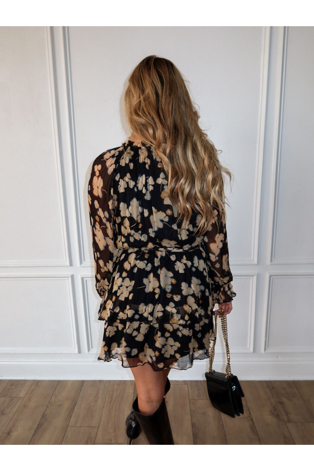 She’s romantic, effortless, and just a little flirty. The Santino Mini Dress by Lucy Paris features a sheer black overlay with a soft beige floral print that floats with every step. Designed with long, billowy sleeves, a tiered ruffle skirt, and a flattering cinched waist, this mini dress is your new go-to for dinner parties, date nights, or weddings