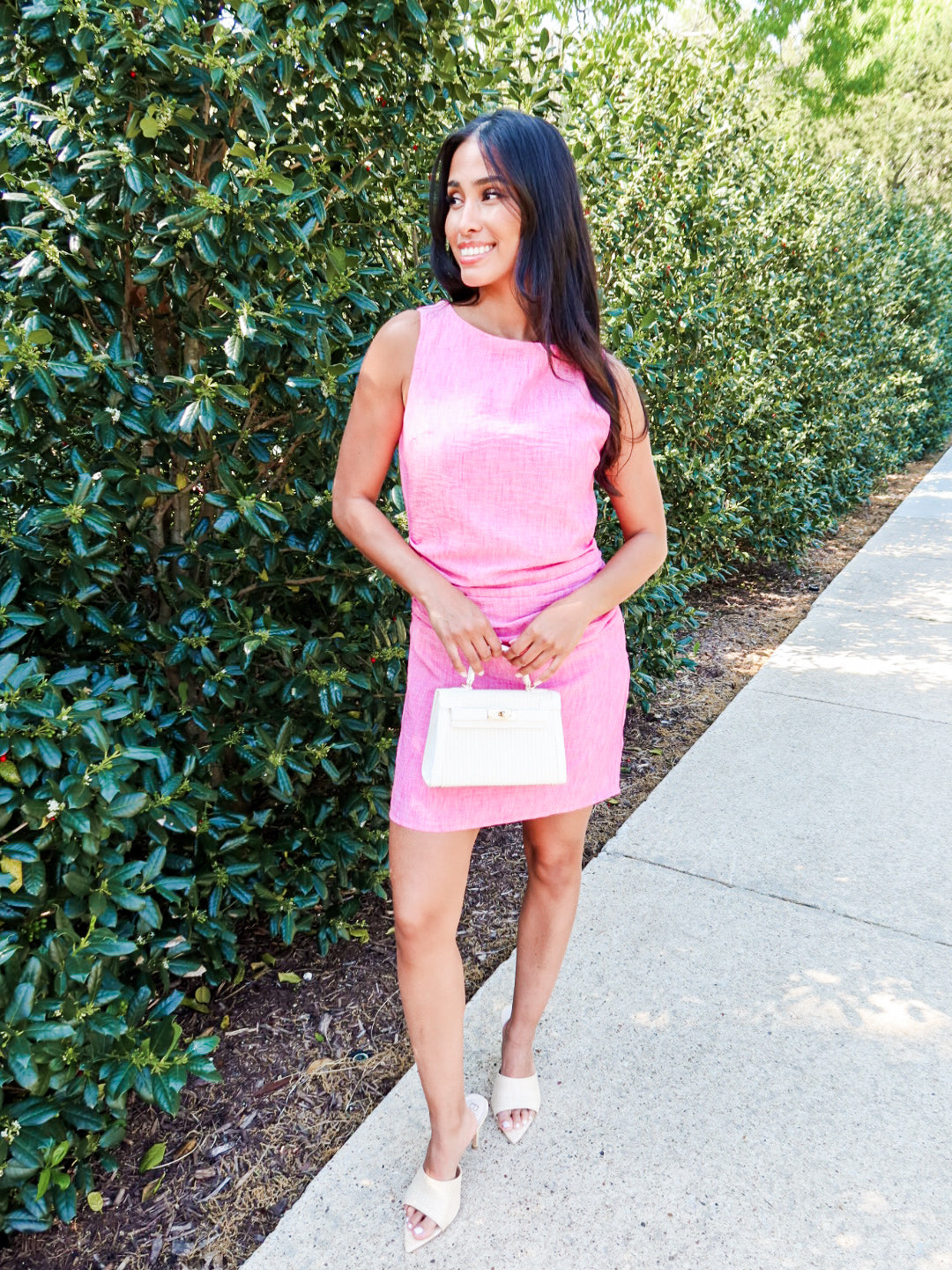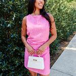 Easy, breezy, and made for sunny days. The By the Sea Mini Dress features a soft pink fabric with a linen-look texture that gives it that effortless coastal feel. Designed with a sleeveless crew neckline and subtle side ruching, this mini flatters through the waist before flaring into a playful skirt.
