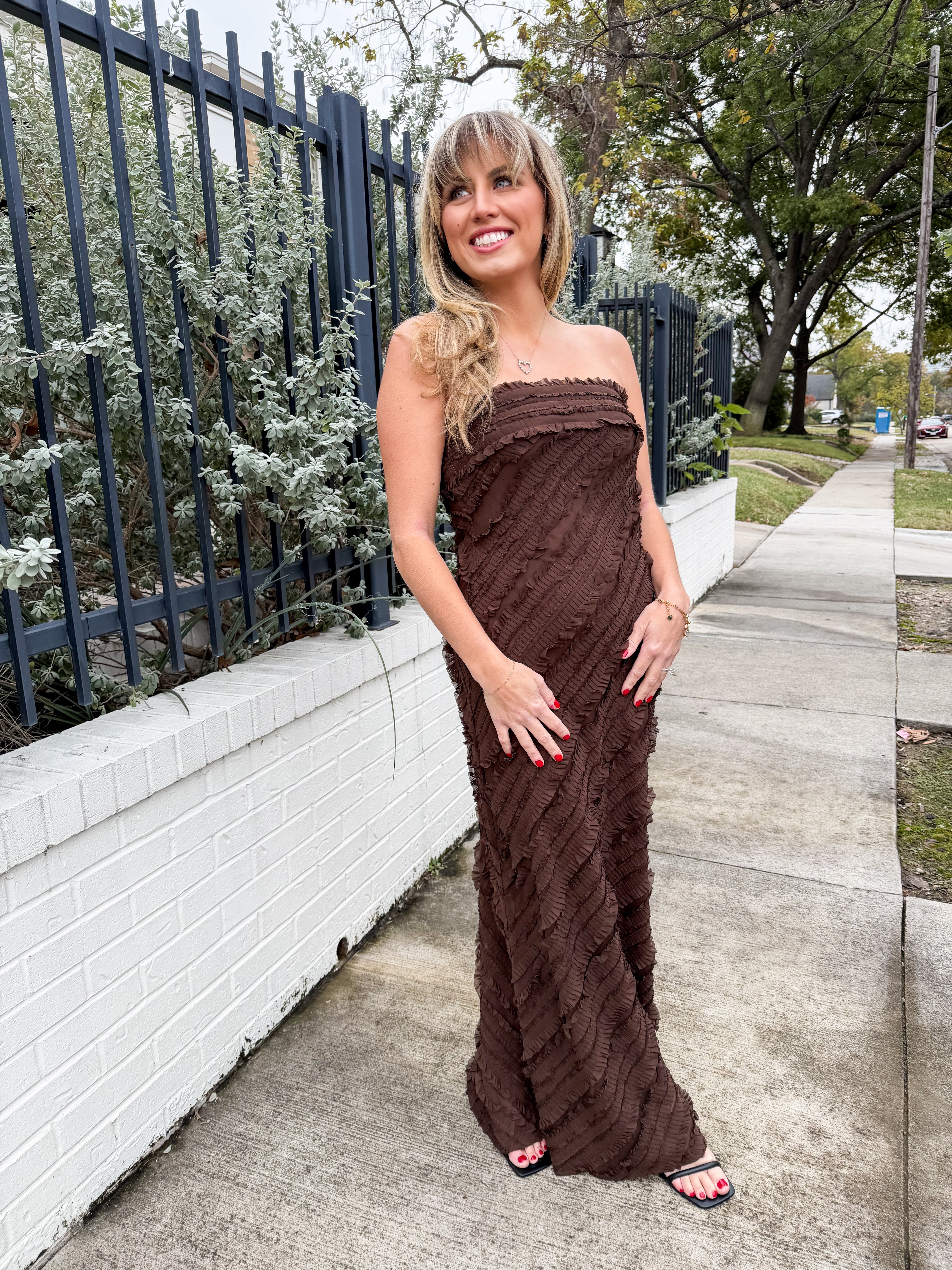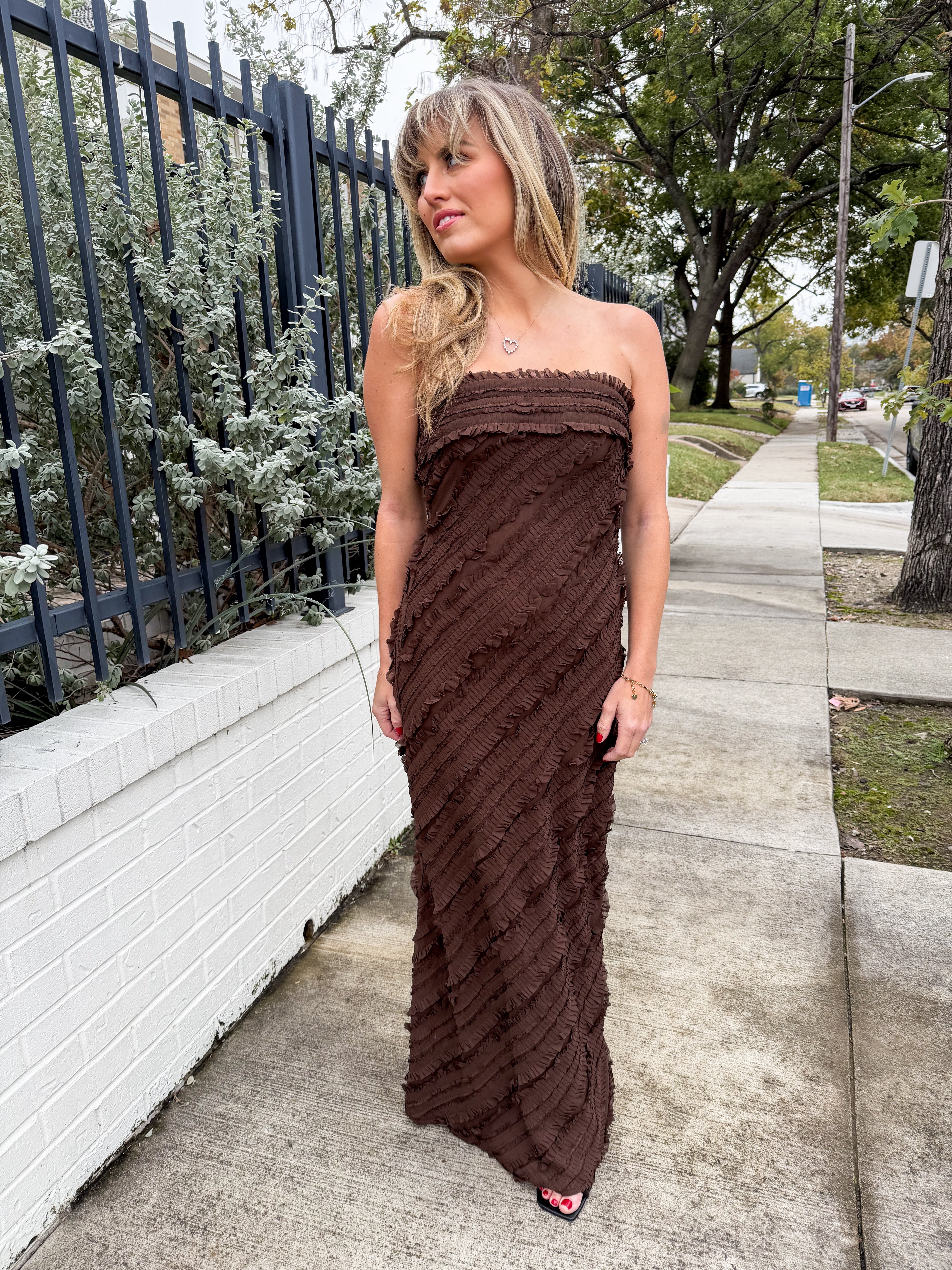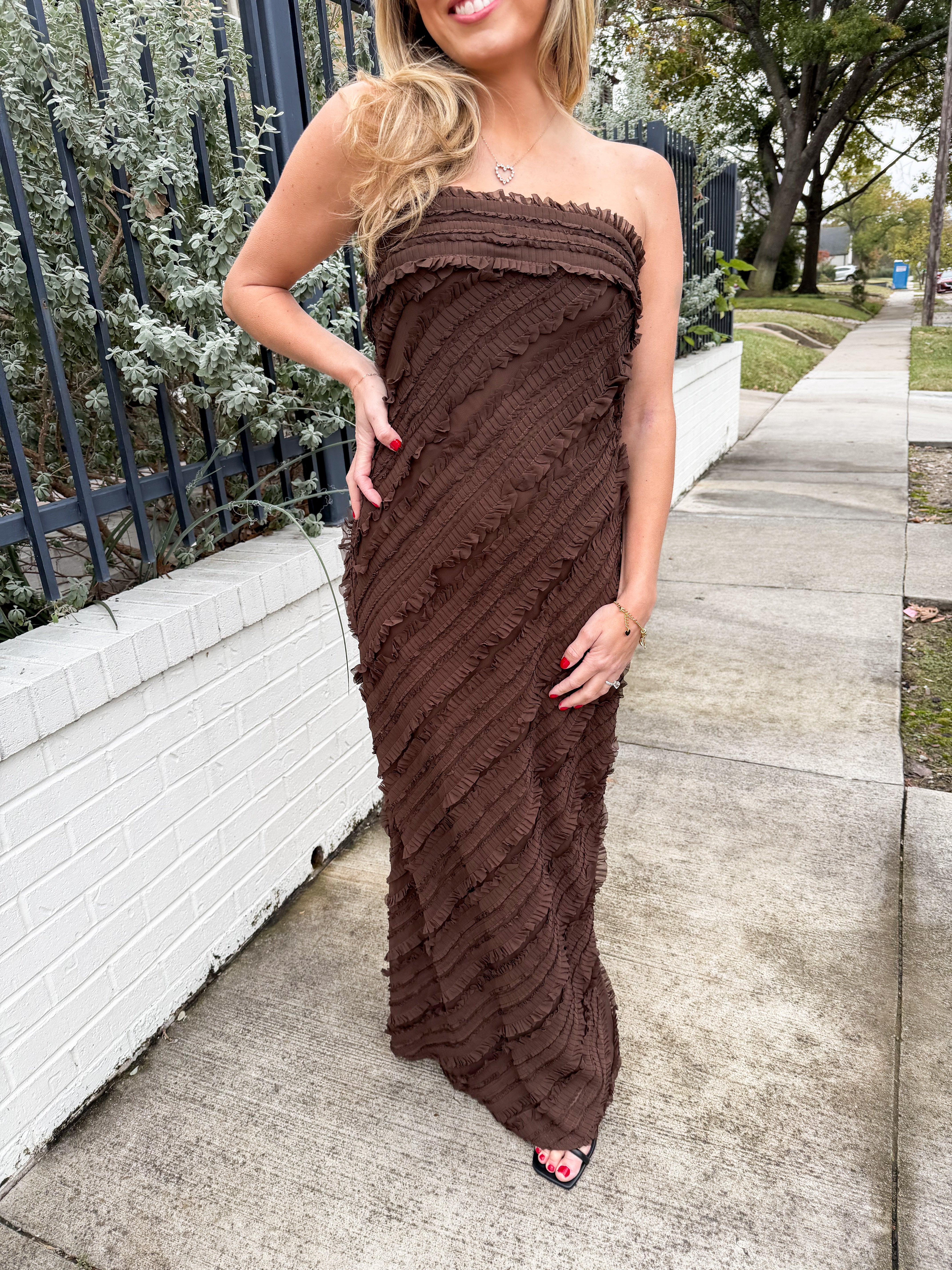 Rich, romantic, and full of movement — the Espresso Drift Maxi brings effortless drama in all the right ways. Designed in a deep espresso brown, this flowy maxi features soft cascading ruffles that ripple with every step, creating a dreamy silhouette that’s feminine without feeling fussy. It’s the dress you reach for when you want to look elevated, unforgettable, and a little bit mysterious.