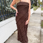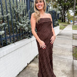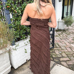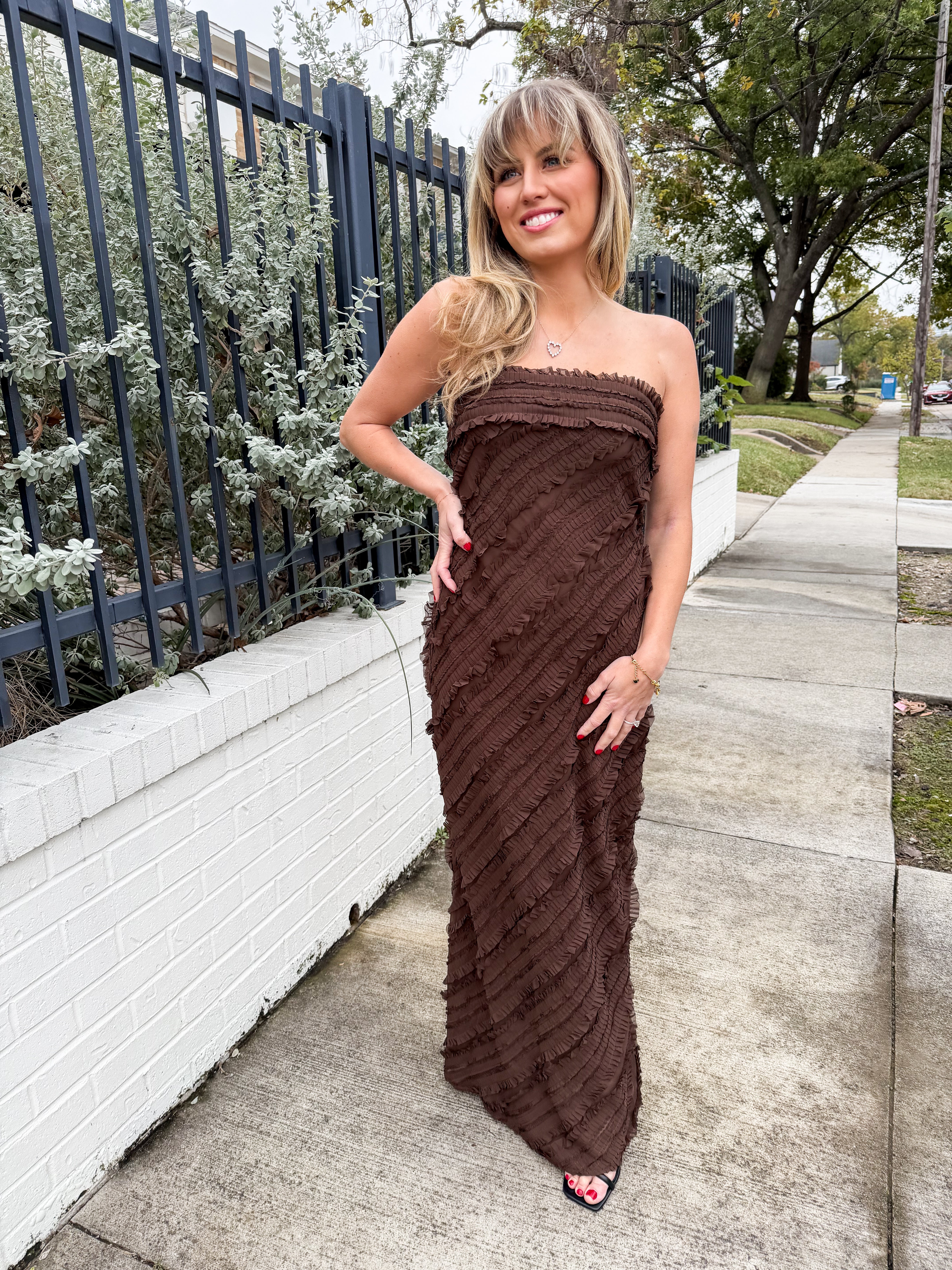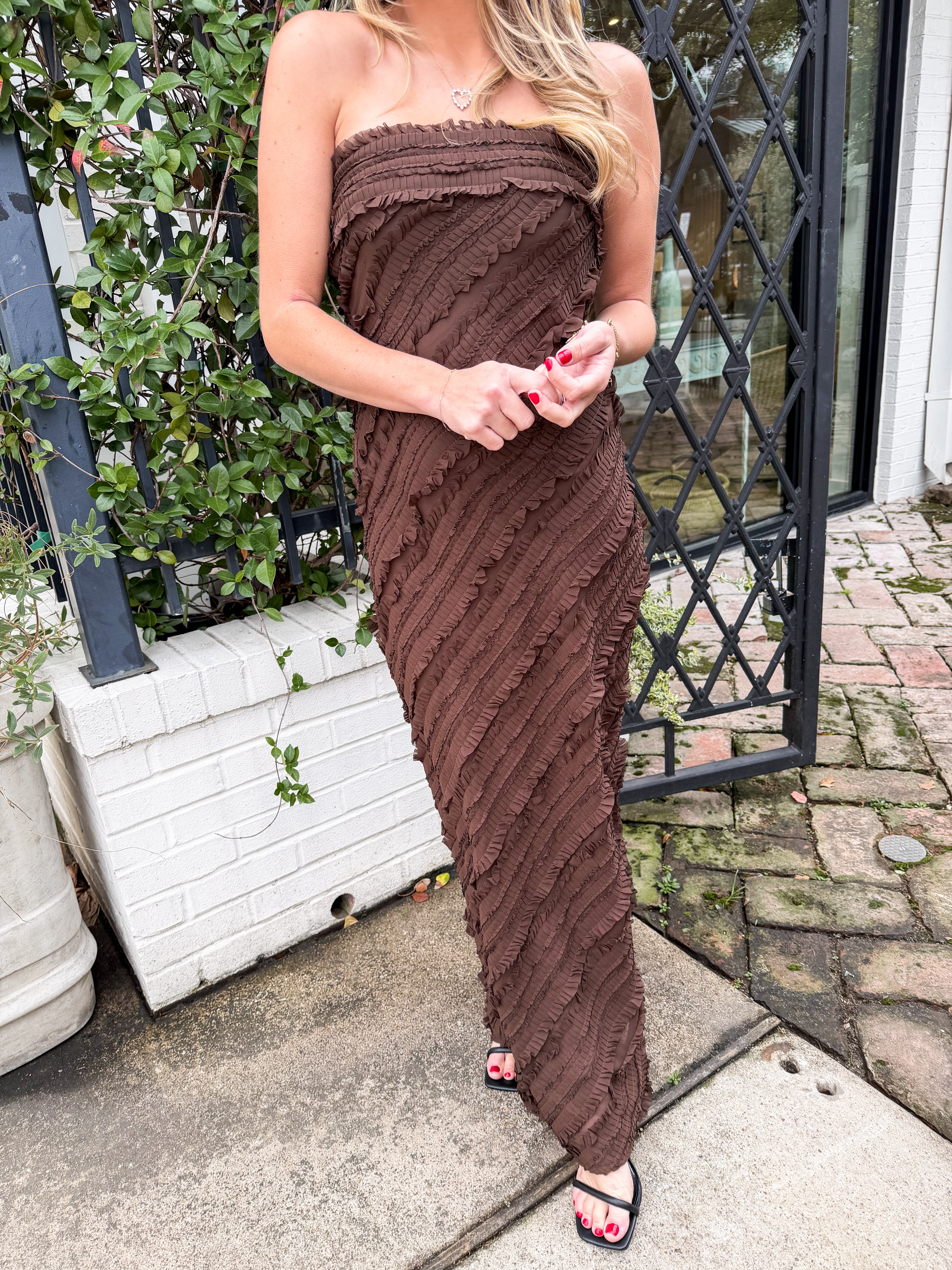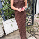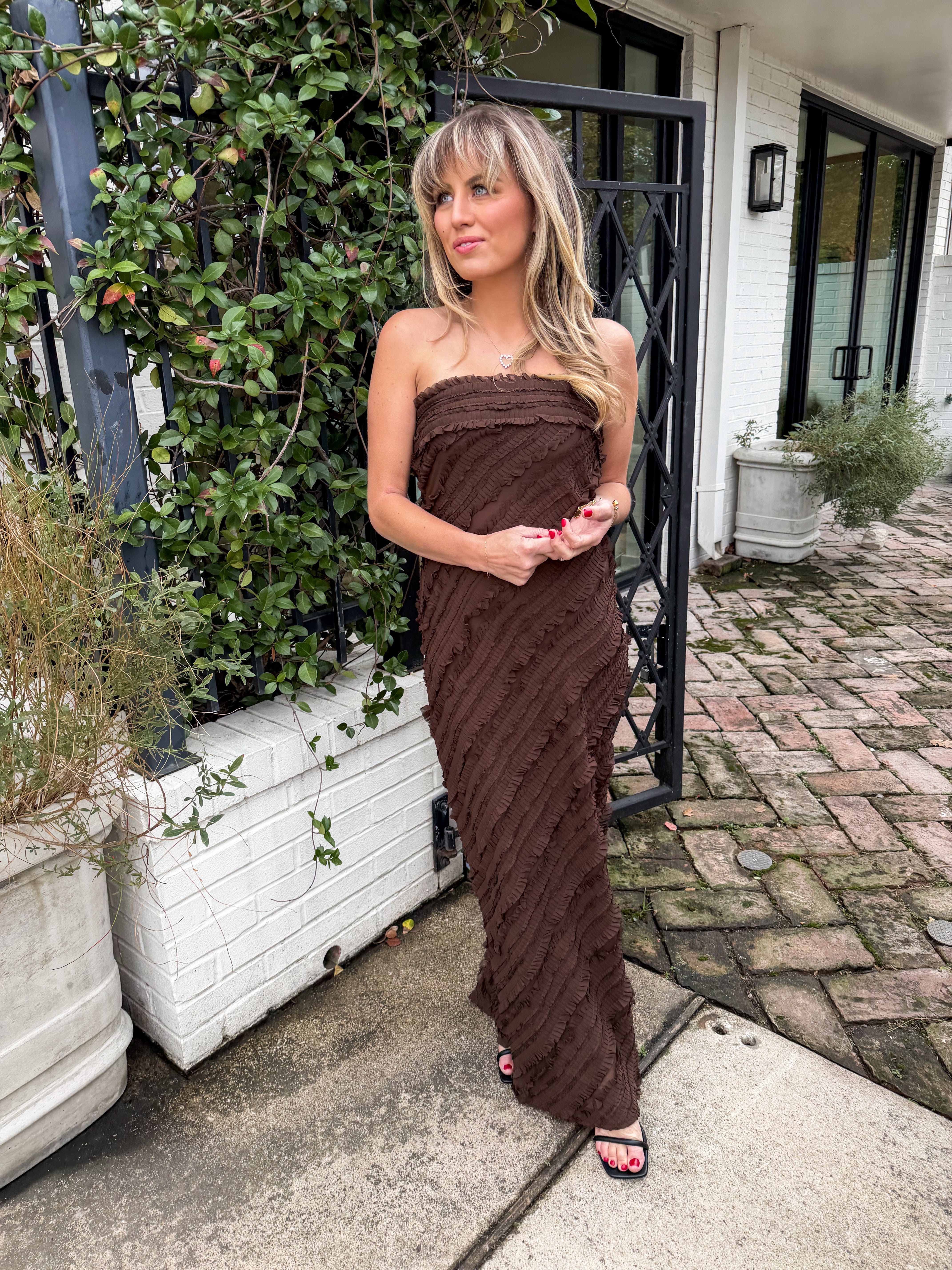 Rich, romantic, and full of movement — the Espresso Drift Maxi brings effortless drama in all the right ways. Designed in a deep espresso brown, this flowy maxi features soft cascading ruffles that ripple with every step, creating a dreamy silhouette that’s feminine without feeling fussy. It’s the dress you reach for when you want to look elevated, unforgettable, and a little bit mysterious.