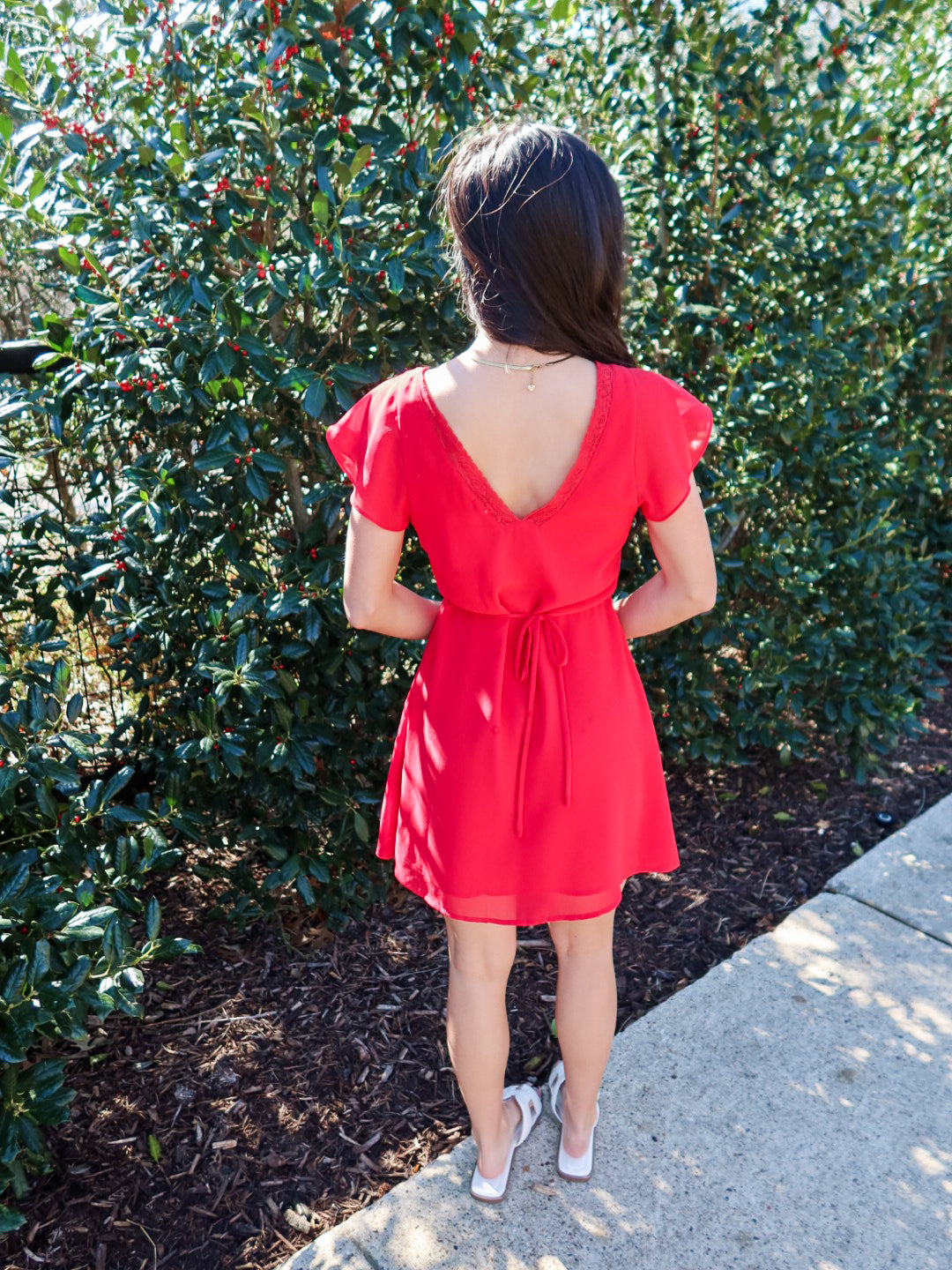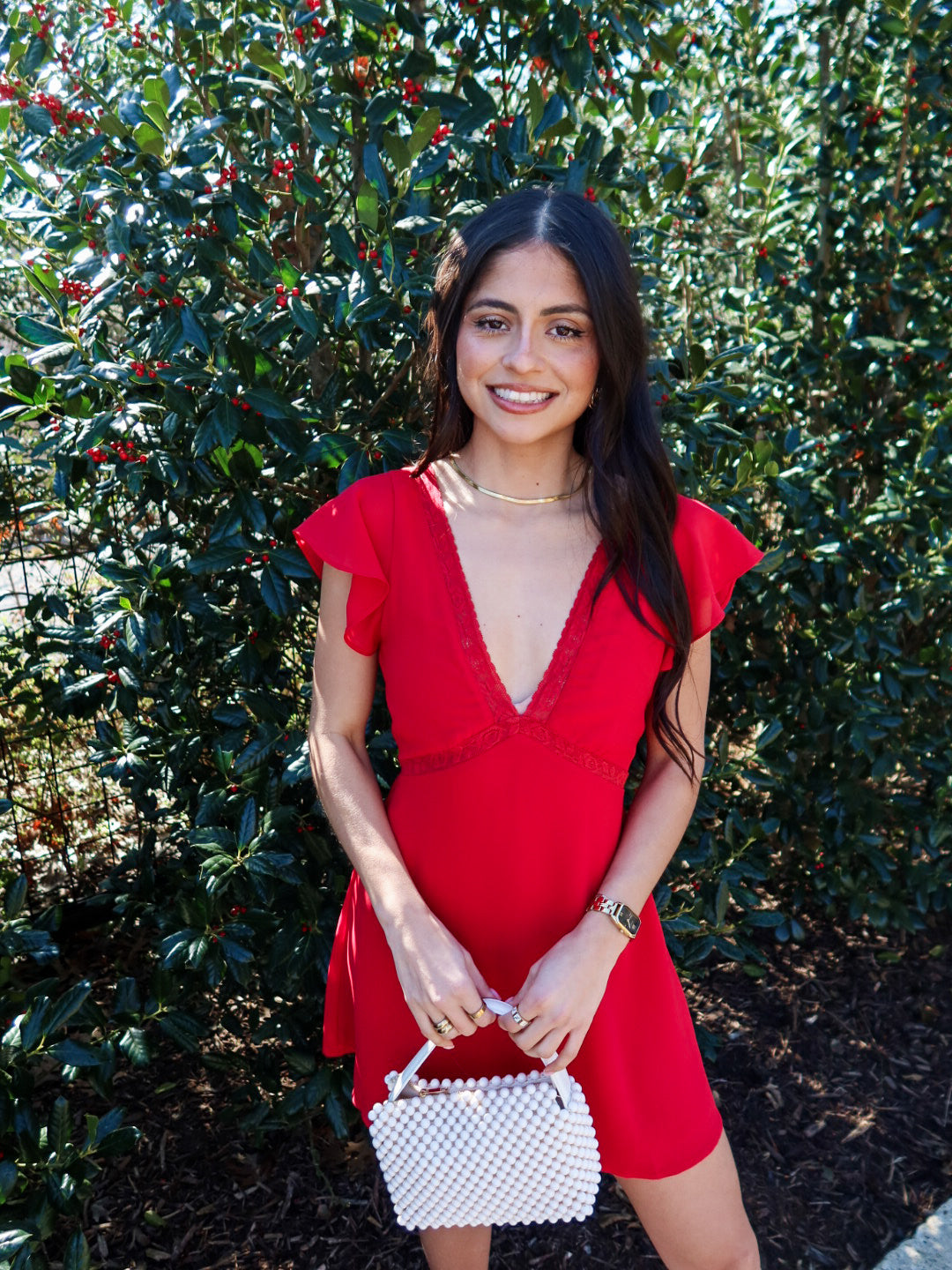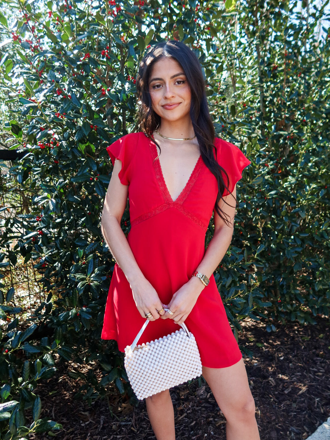 The Crimson Crush Mini Dress features a V-cut neckline with red lace trim and a flowy silhouette—lightweight, feminine, and perfect for nights out.