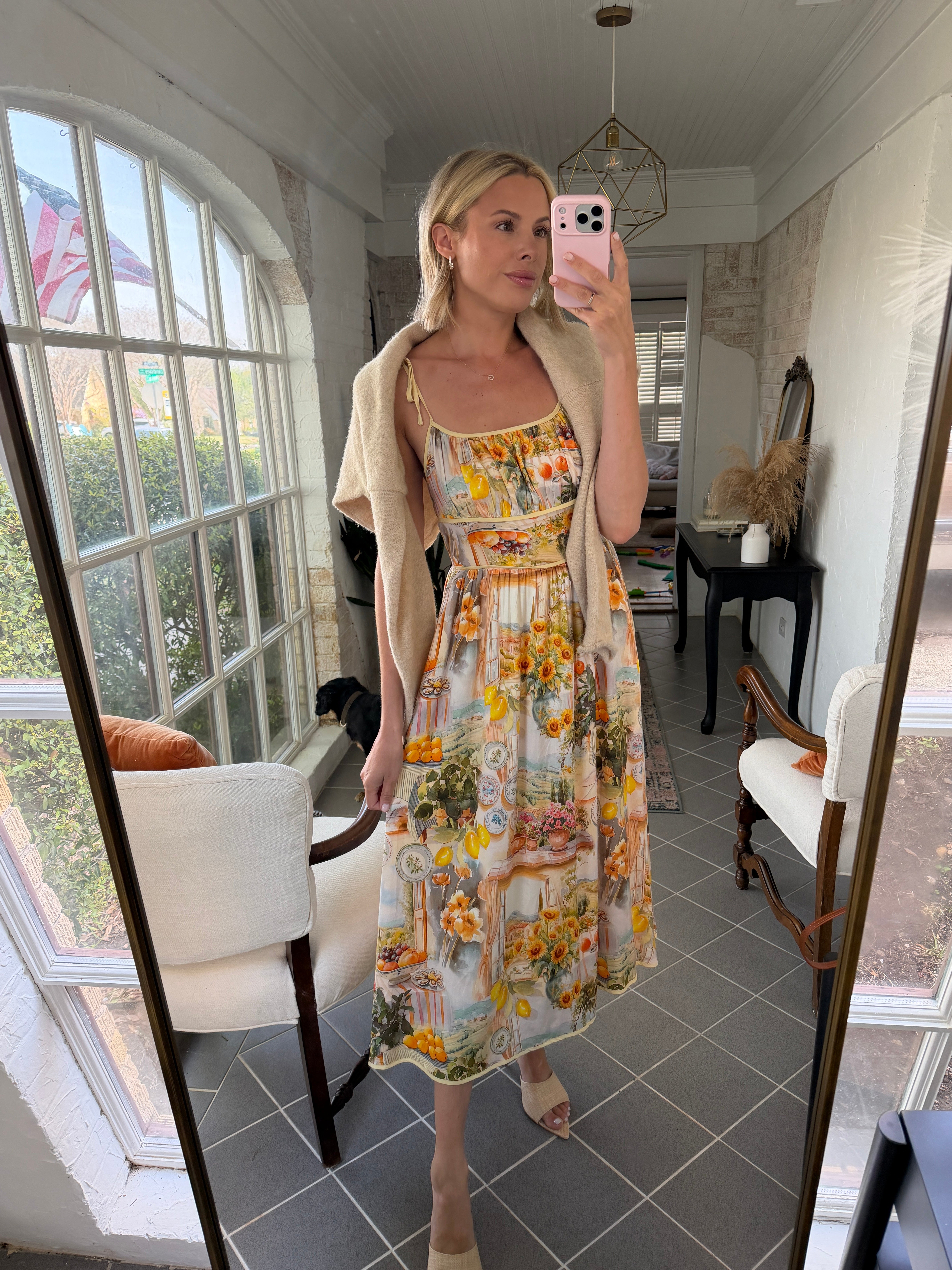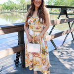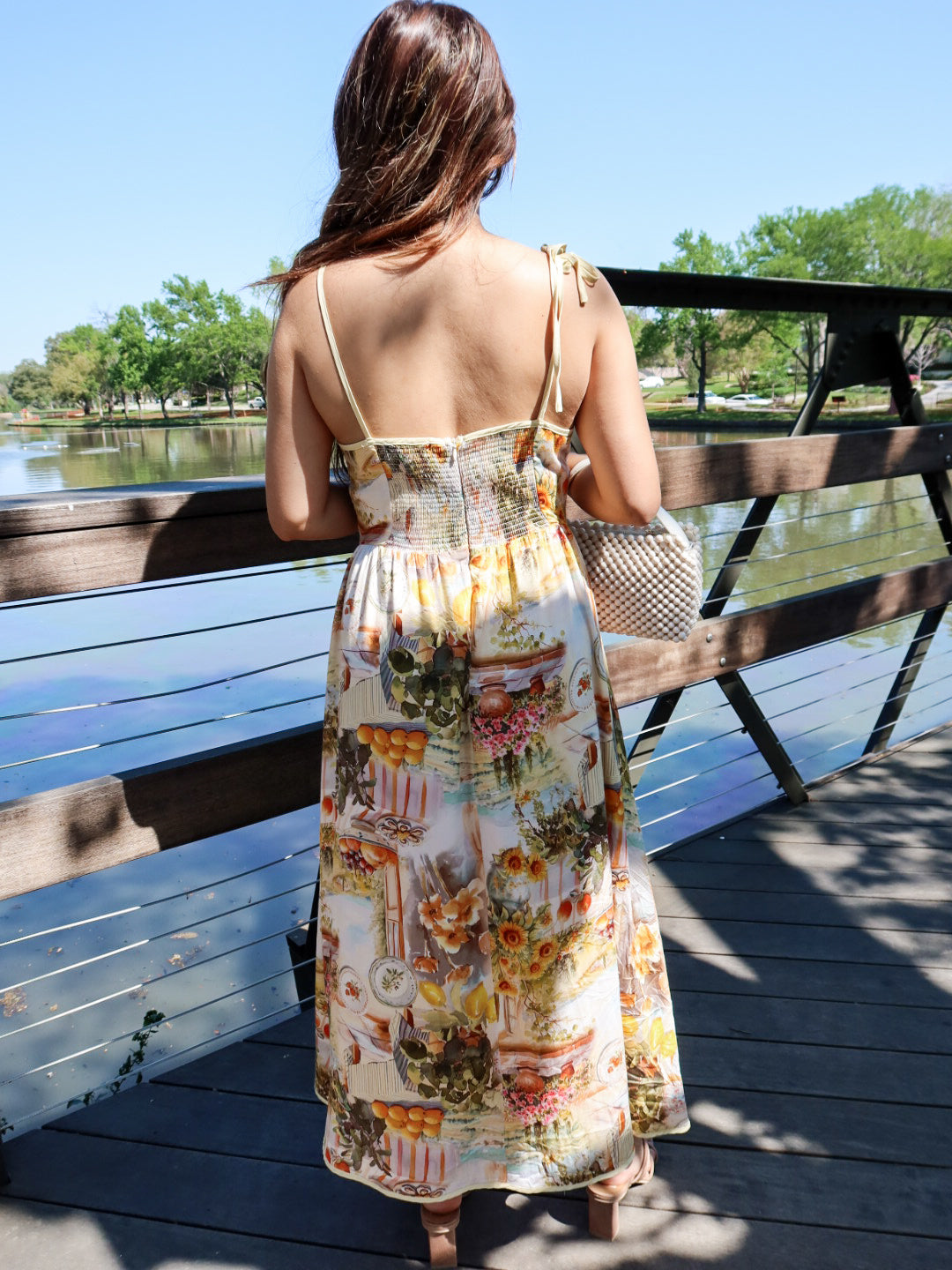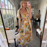 Bright, breezy, and made for sunshine-filled days. The Limoncello Midi Dress features a vibrant Mediterranean-inspired print with playful colors and charming motifs—think citrus, plates, and seaside Italian café vibes. Designed with delicate spaghetti tie straps and a flowy midi silhouette, this dress moves beautifully while keeping things light and effortless.