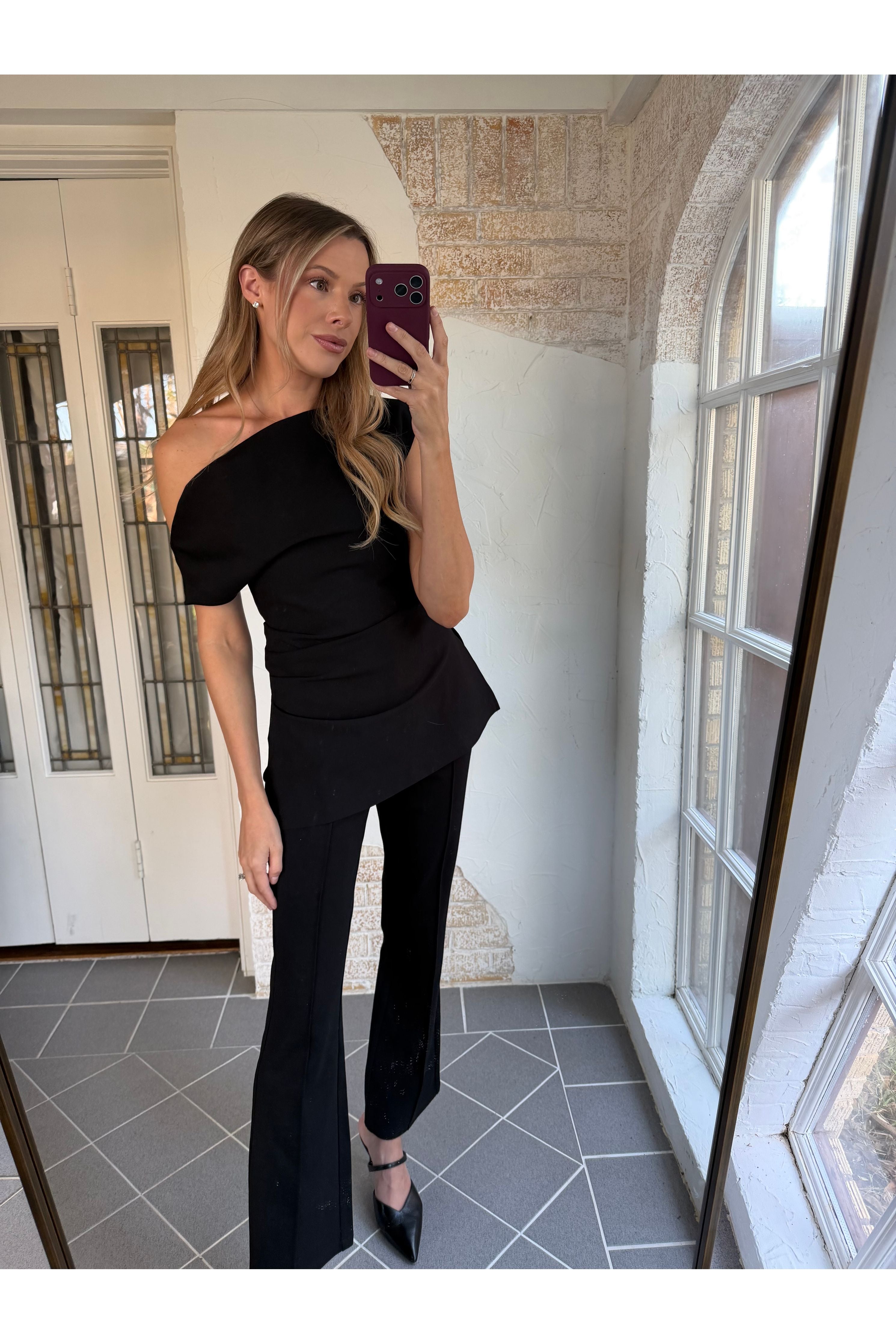 The set that means business — but make it chic. The Power Move Set features an asymmetric one-shoulder top with a sleek, sculpted fit and matching ponte pants designed with a front pleat and side zipper. Tailored yet stretchy, it’s your go-to look for when you want to feel confident, polished, and just the right amount of extra.