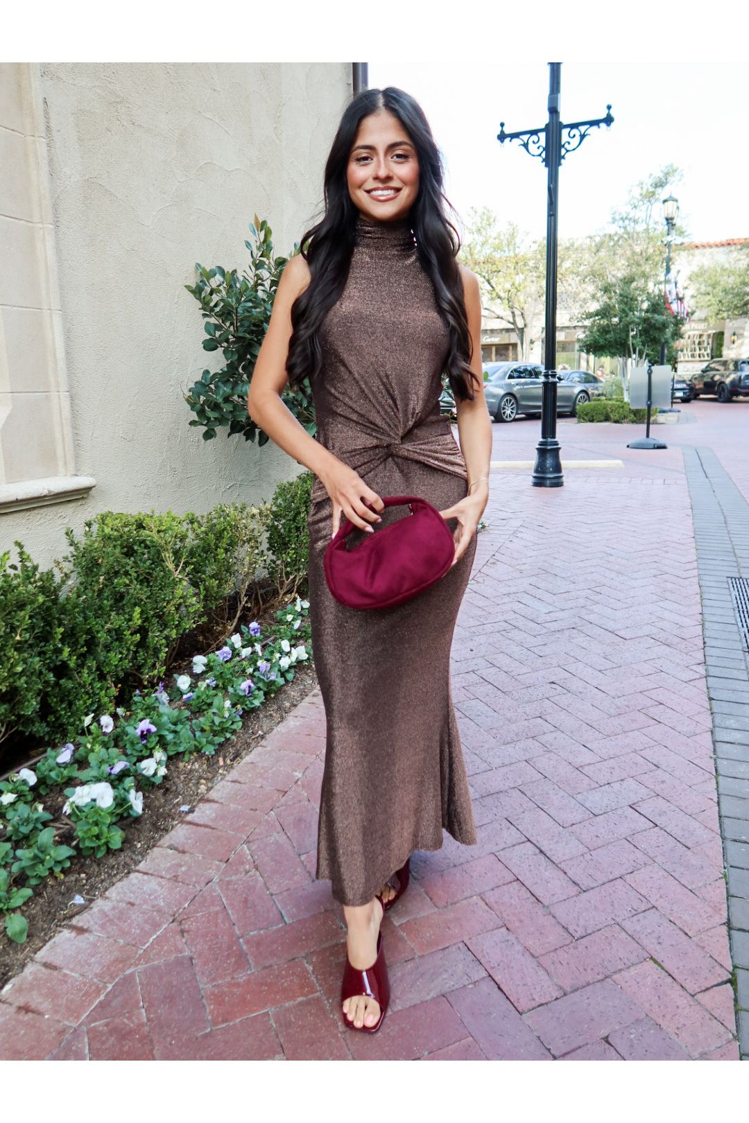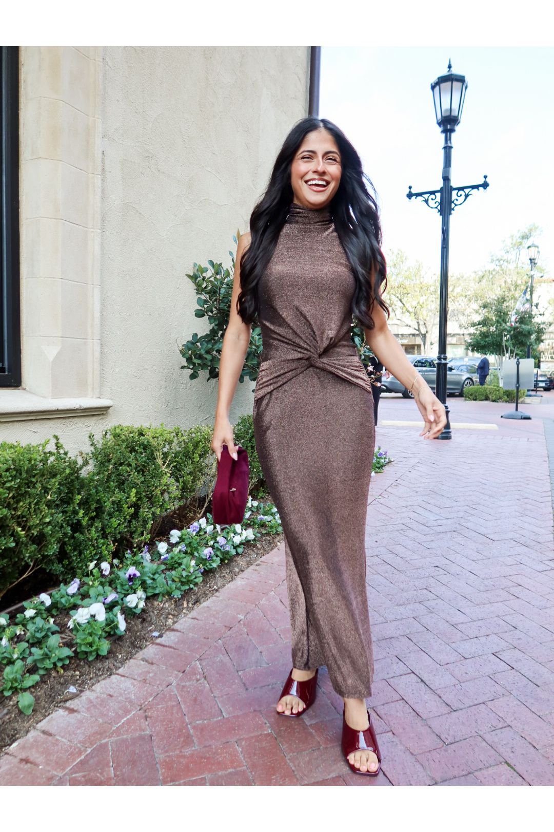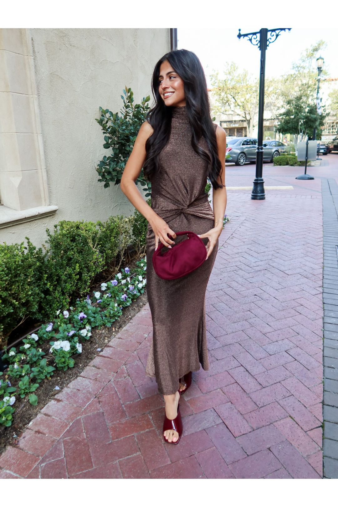 Sleek. Sculpted. Stunning. The Riana Dress in brown metallic brings effortless sophistication with its mock neckline, twist-front waist detail, and subtle shimmer that catches the light just right. Perfect for date nights, holiday parties, or any moment that deserves a little drama.