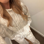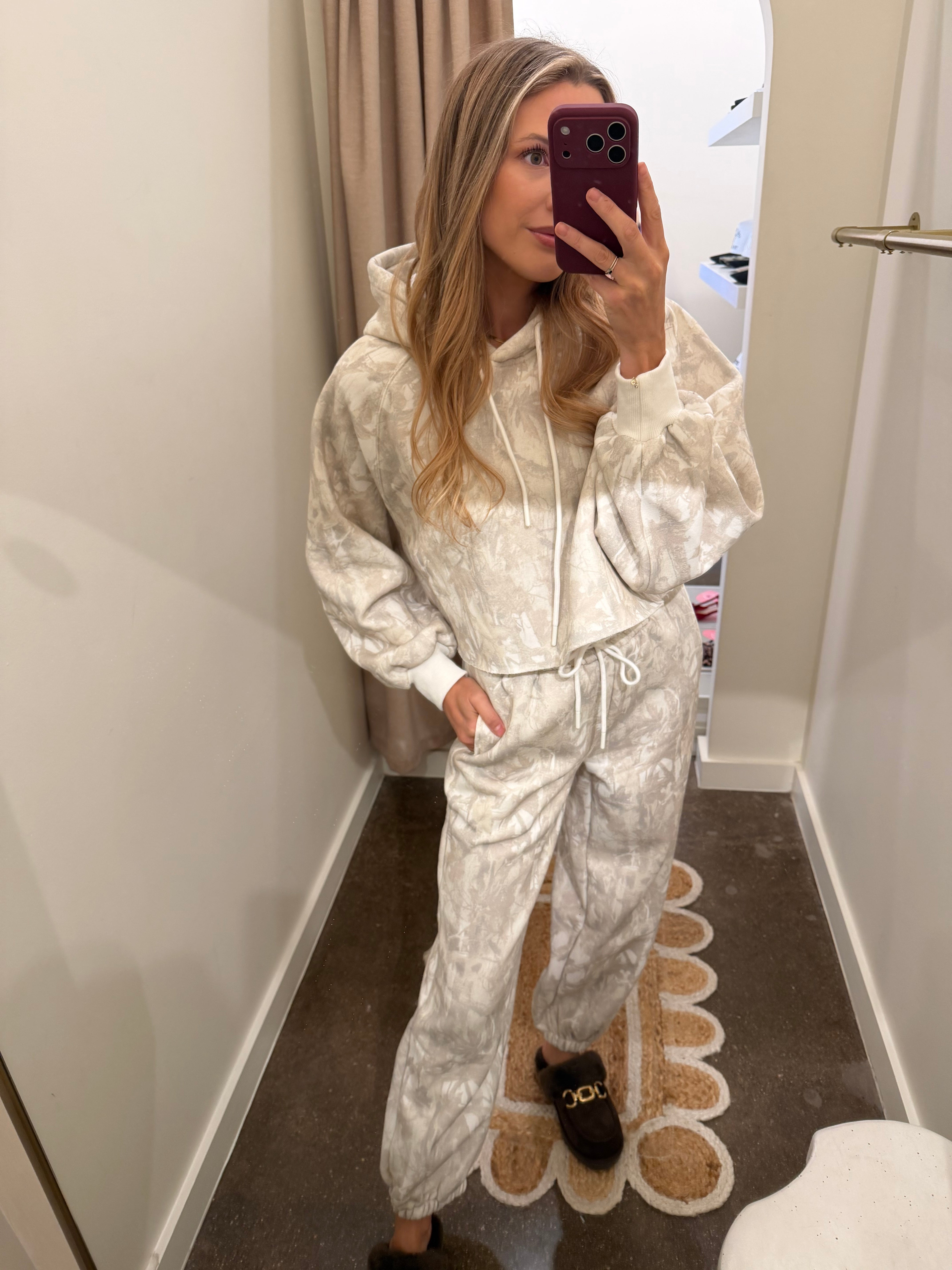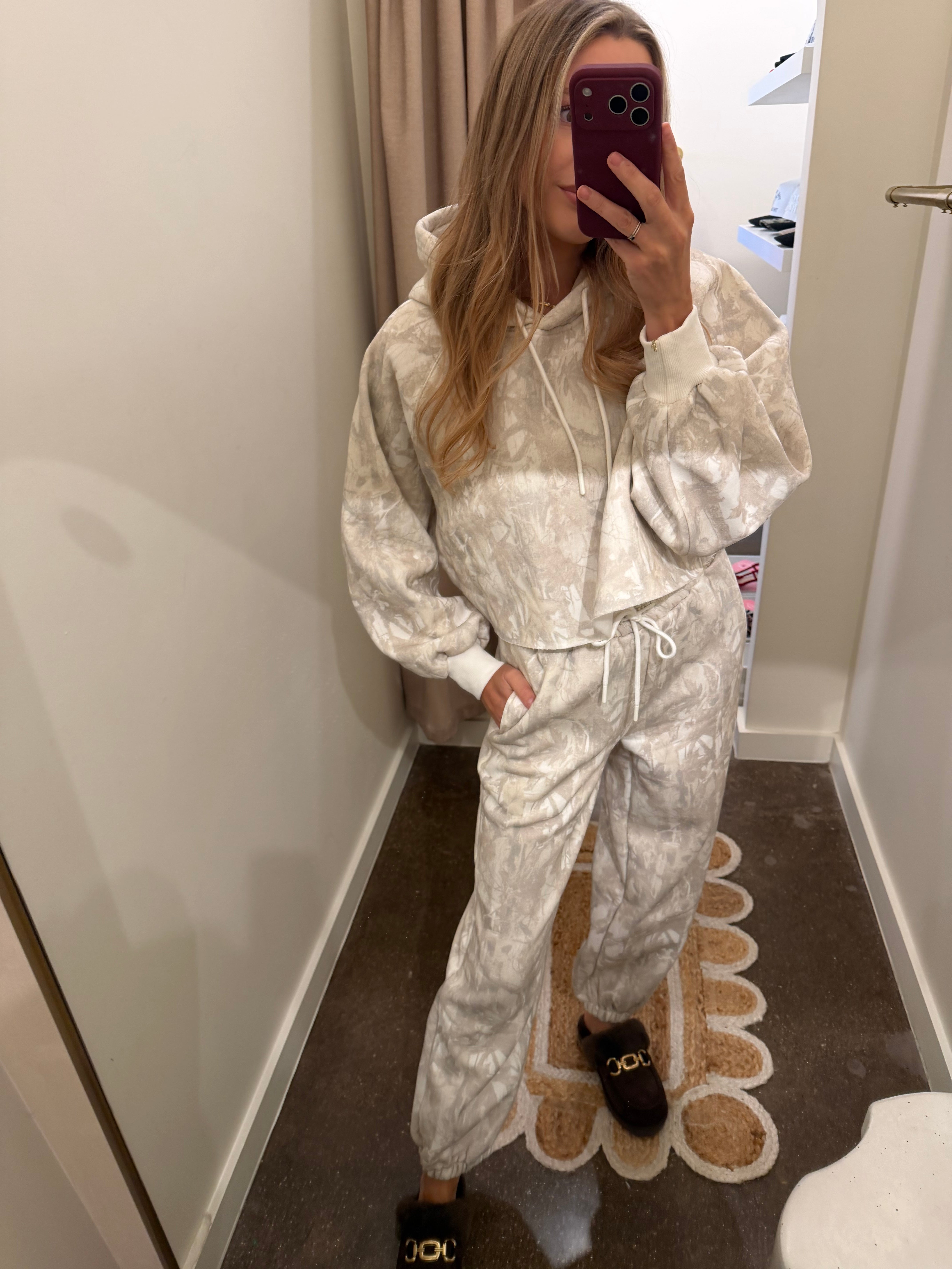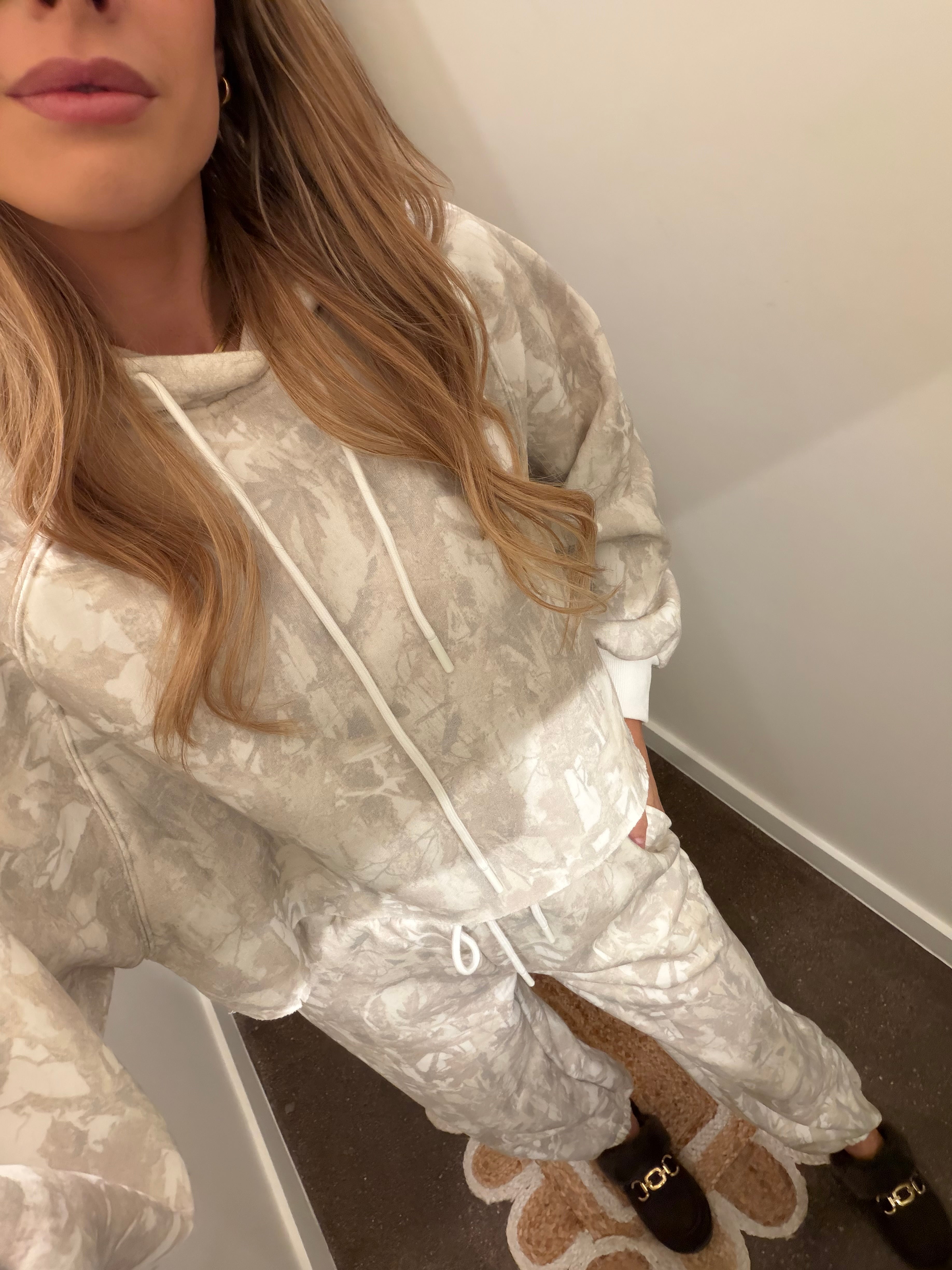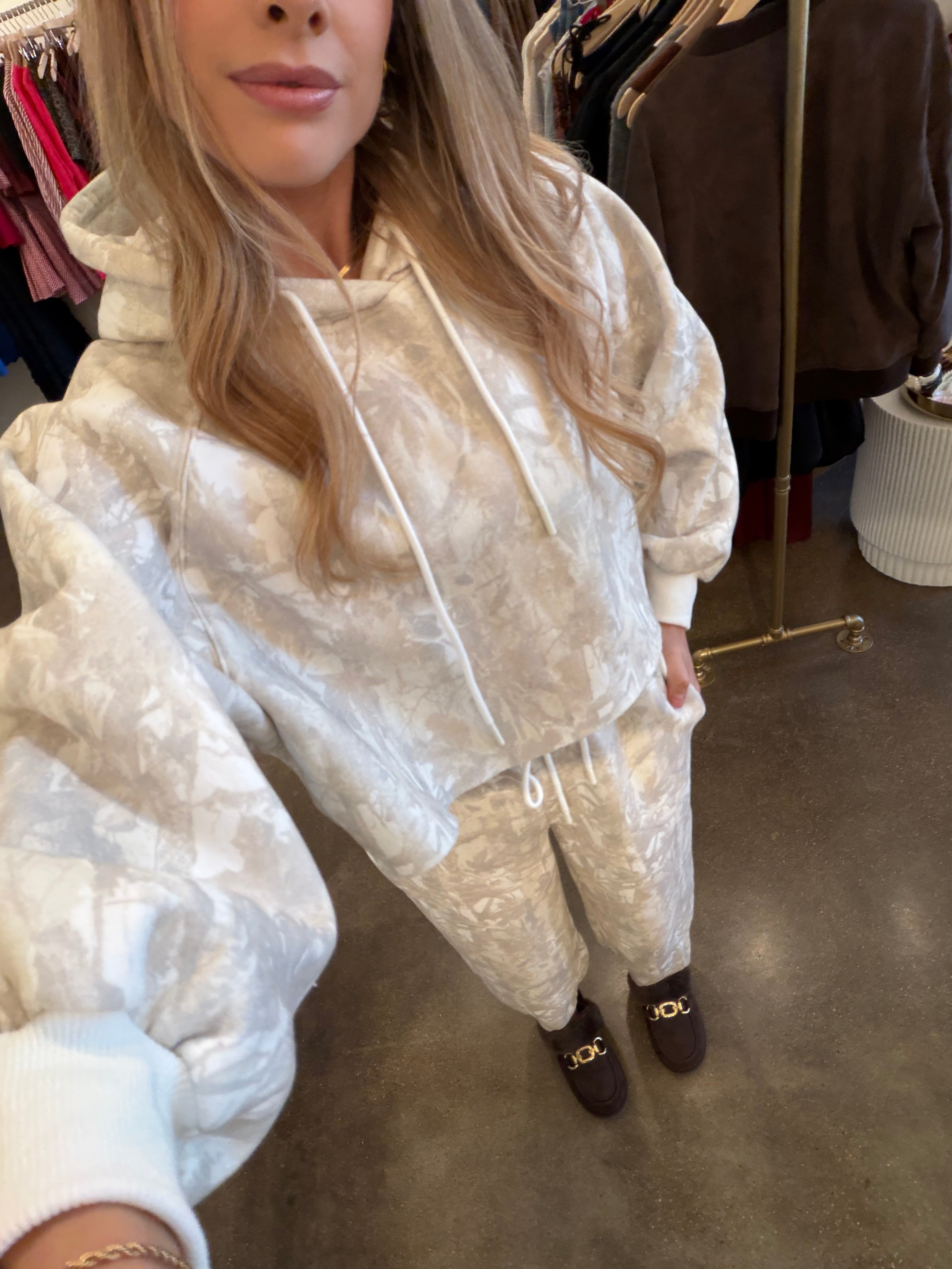 Weekend-ready and cozy in all the right ways. The Off Duty Camo Set features a cropped hoodie and matching joggers in a soft, neutral camo print. Effortlessly cool and made for lounging, errands, or travel days — it’s the perfect mix of laid-back and pulled together.