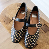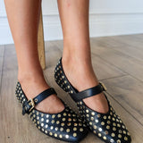Sweet meets statement in the Mulaney Studded Flats by Dolce Vita. These aren’t your childhood ballet shoes—think elevated, edgy, and effortlessly cool. Covered in gold studs with a sleek black base and a top strap for extra style (and security), they bring just the right amount of bold to any outfit.