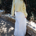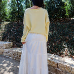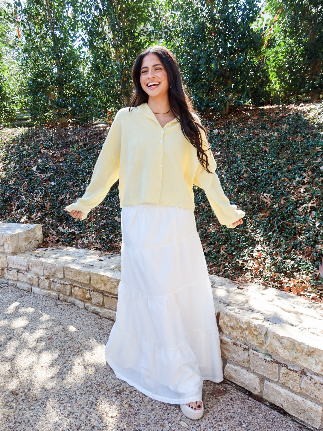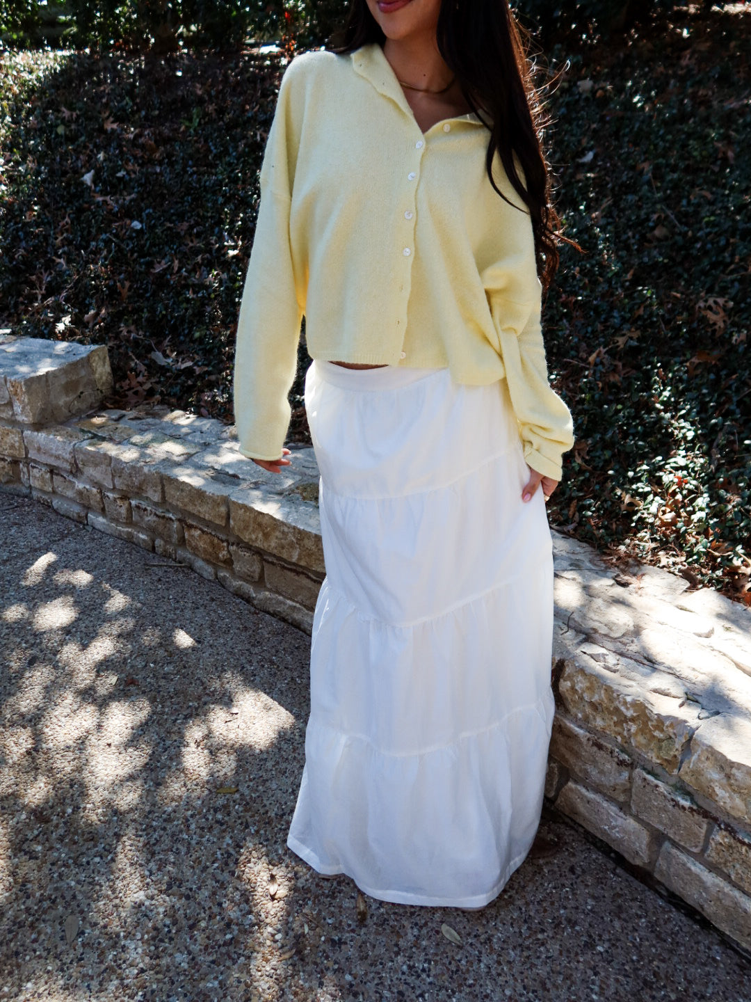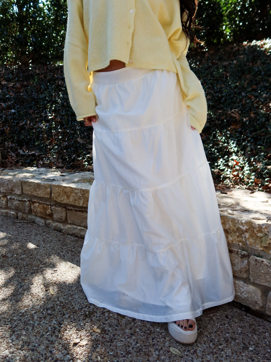 Soft, romantic, and effortlessly flowy. The Daisy Tiered Maxi Skirt features a beautiful white silhouette with gentle, connected ruffle tiers that blend seamlessly into one another for a smooth, flattering drape. Instead of stiff, structured tiers, this skirt flows as one — creating movement, softness, and an easy elegance you’ll love.