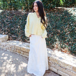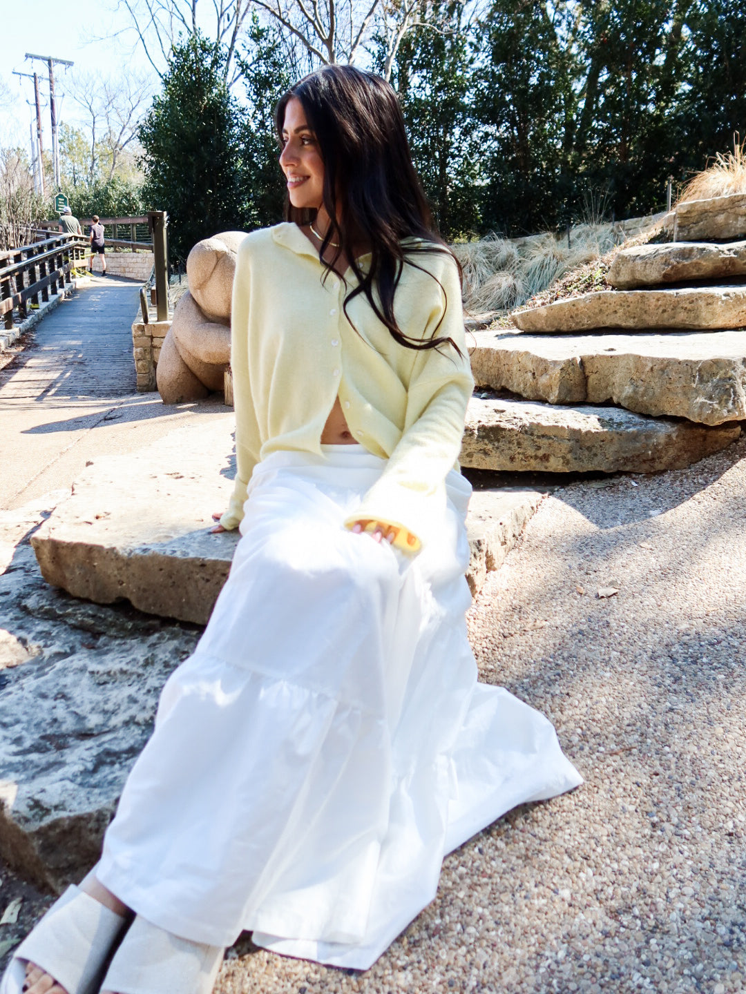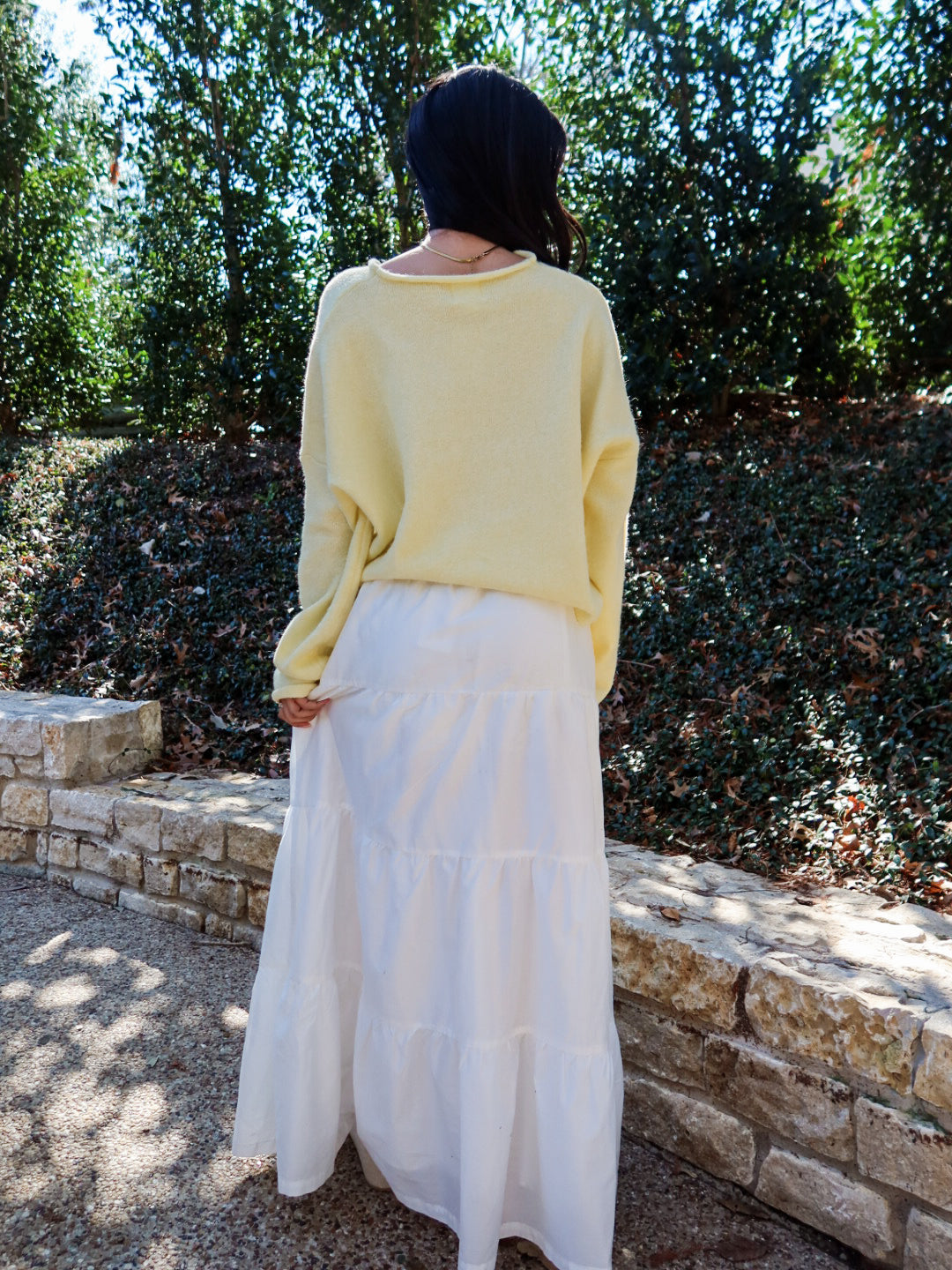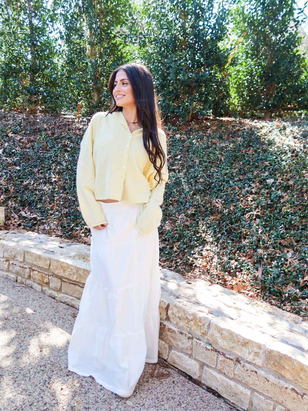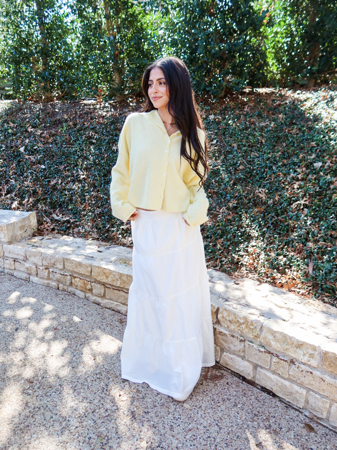 Soft, romantic, and effortlessly flowy. The Daisy Tiered Maxi Skirt features a beautiful white silhouette with gentle, connected ruffle tiers that blend seamlessly into one another for a smooth, flattering drape. Instead of stiff, structured tiers, this skirt flows as one — creating movement, softness, and an easy elegance you’ll love.