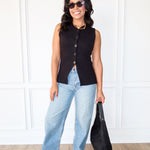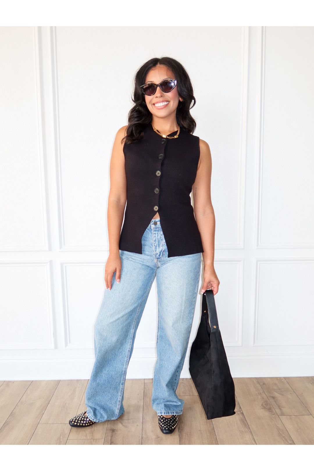 Meet the Button Effect Vest—a modern layering piece with a little extra edge. This black knit vest features an exaggerated V-neckline, oversized tonal buttons, and a sleek front slit that adds just the right amount of drama. It’s soft, slightly structured, and endlessly versatile—whether you wear it solo or pop it over a tee or dress.