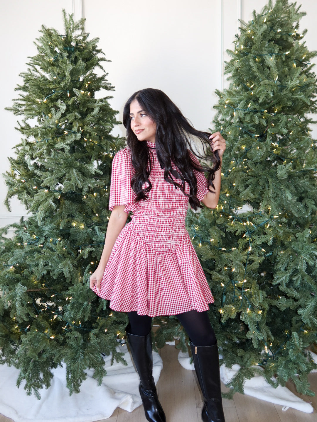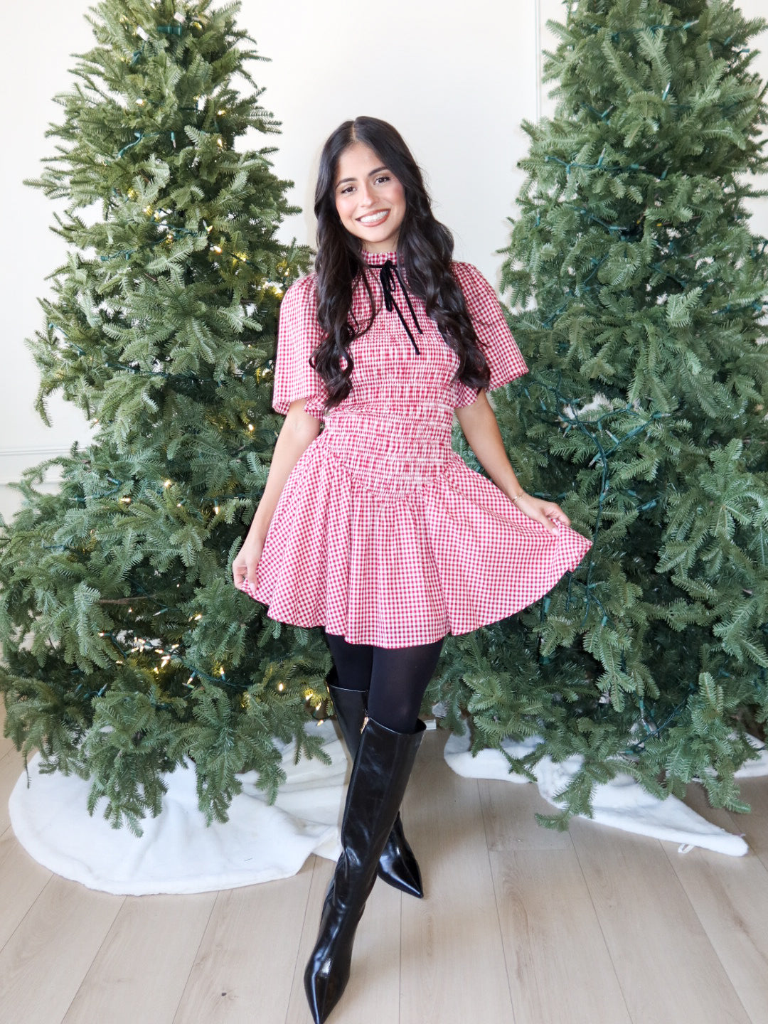– Red gingham mini with a flattering fit-and-flare silhouette