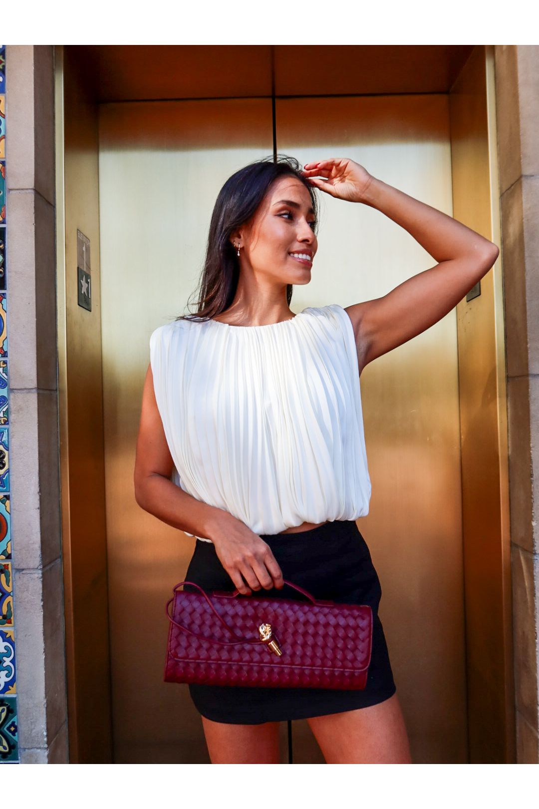 Romantic and refined, the Amour top is your go-to for an elevated night-out or holiday-ready look. Featuring delicate pleating throughout, this sleeveless shell-hued blouse has a soft bubble hem that gives it just the right amount of volume and structure. Fully lined for comfort and crafted from a silky, lightweight fabric that drapes beautifully.