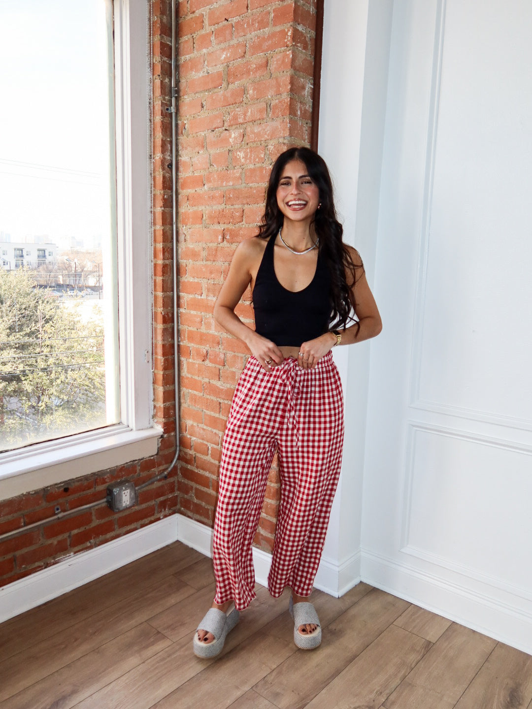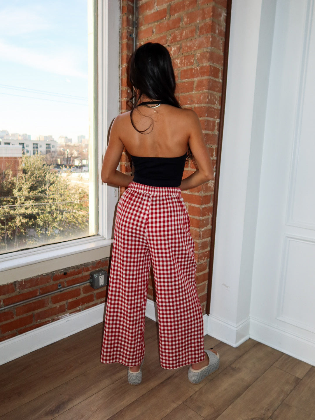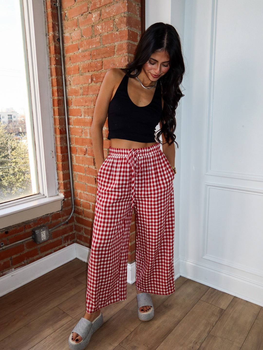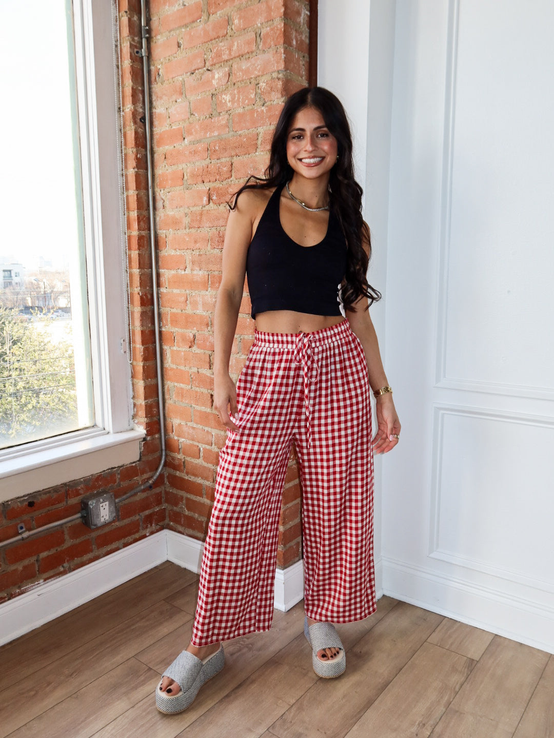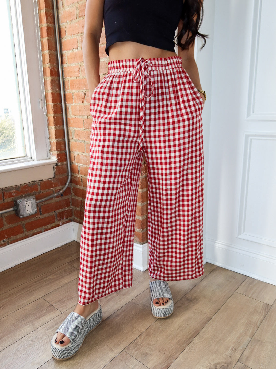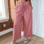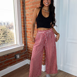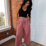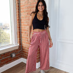 Sweet, flowy, and made for all-day comfort. The Apple Butter Pants feature a classic red gingham print with a lightweight, breezy feel that moves beautifully with you. Designed with a relaxed wide-leg silhouette and an easy elastic waistband, these pants are perfect for lounging at home, running errands, or dressing up for casual plans.