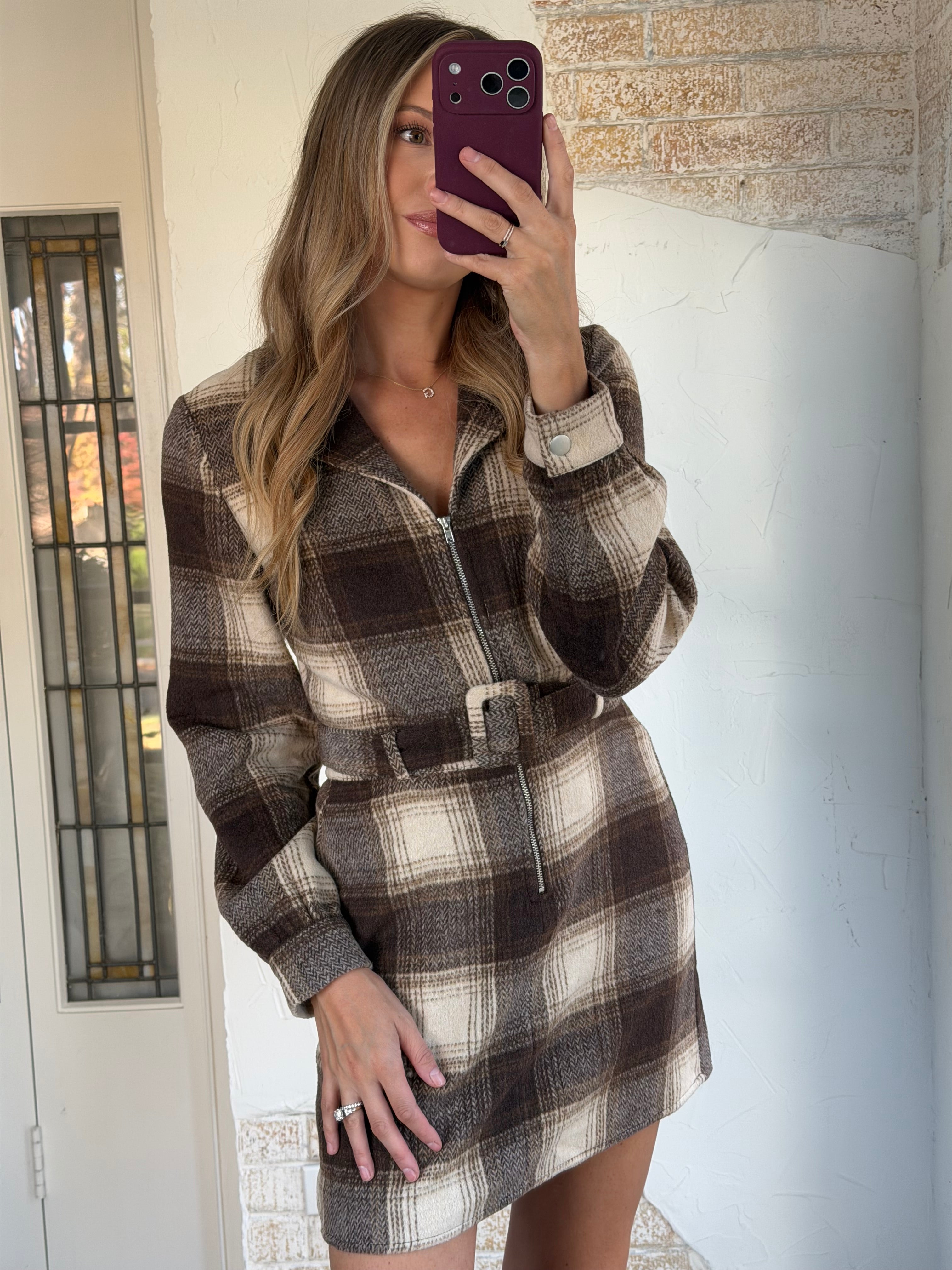 A little preppy, a little flirty, and totally effortless. The Check Yes Mini Dress features a cream-and-brown plaid vibe with a functional front zipper and a waist-defining belt that pulls everything together. Structured but comfortable, this mini is your new go-to for fall outings, coffee runs, or casual nights out.