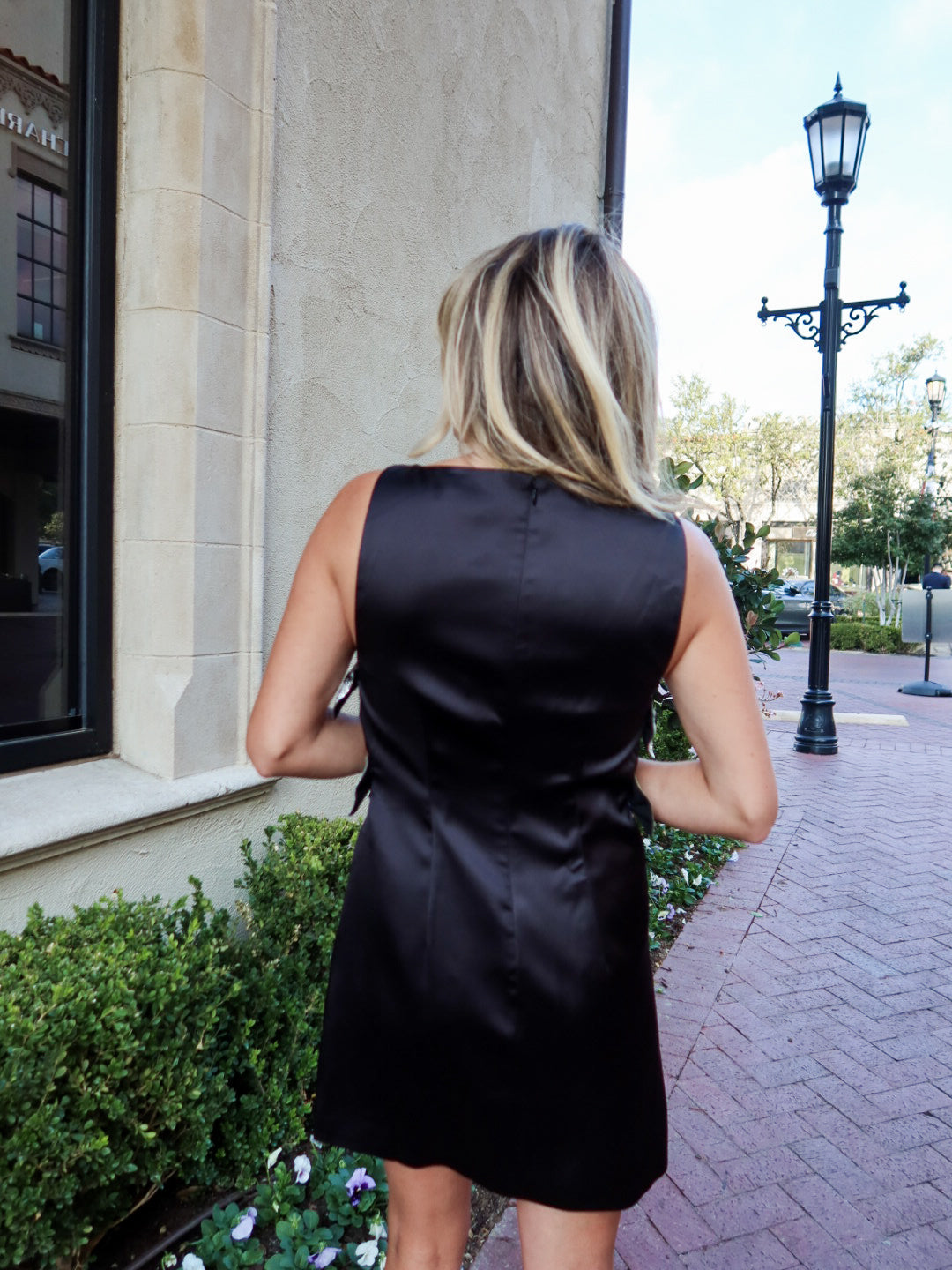 Meet the mini made for a main character moment. The Kinsey Dress in black features sleek satin fabric and two crystal-embellished side bows with peekaboo cutouts for the perfect mix of flirty and polished. Effortlessly glamorous and ready for any night that calls for a little extra sparkle.