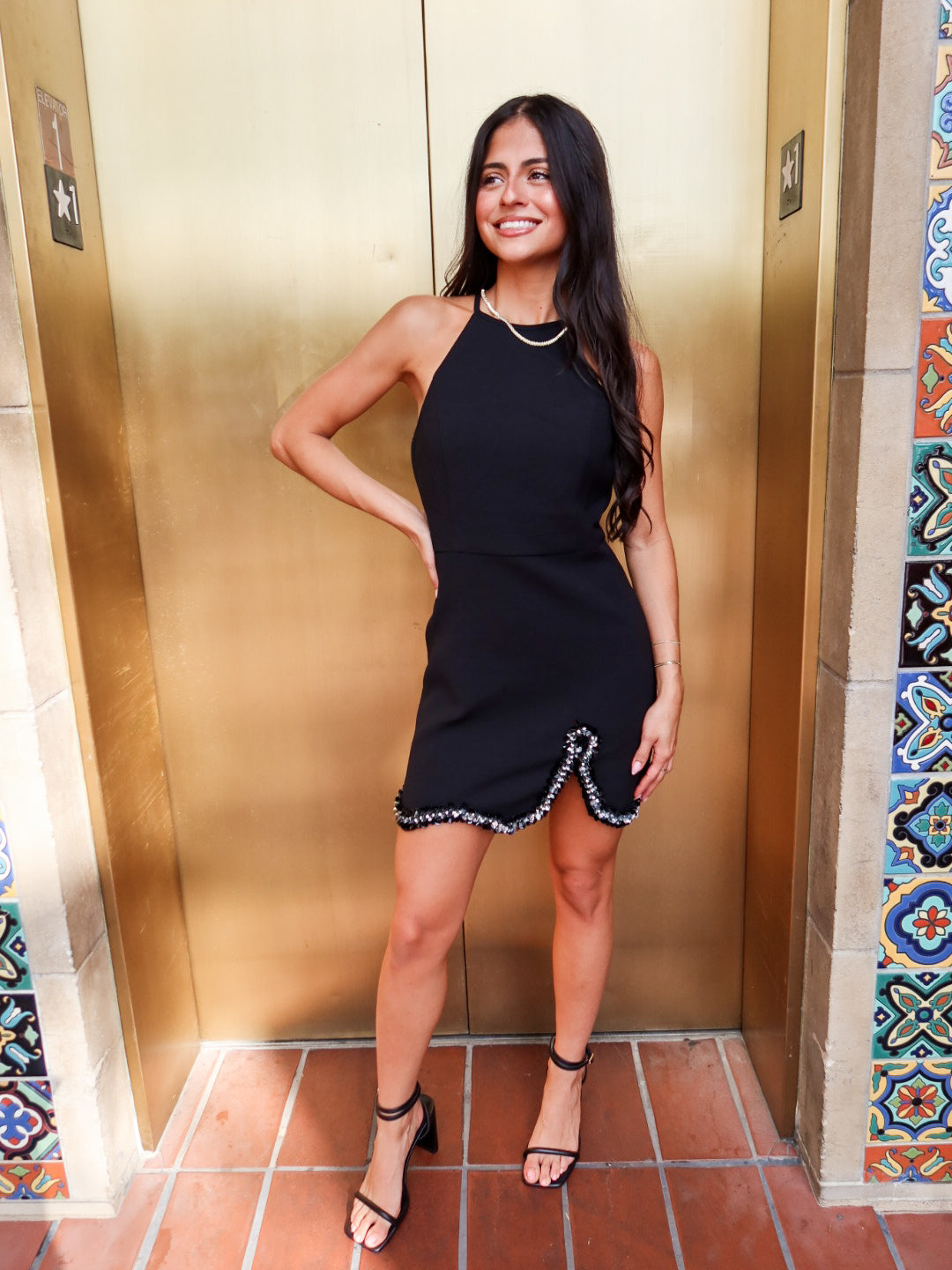 Simple, sleek, and just the right amount of extra. The Midnight Spark Mini Dress features a chic high neckline, flattering mini silhouette, and a crystal-embellished hem that brings the party with every step. Effortlessly polished and made to shine — this one’s a total head-turner.