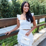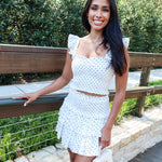 Playful, feminine, and effortlessly put together. The Spotted Charm Set features a crisp white base with classic black polka dots in a flattering two-piece silhouette. The top is designed with a ruched bodice that hugs comfortably through the bust and delicate flutter sleeve details that add a soft, romantic touch. The matching mini skirt features a smocked waistband and tiered ruffle layers that create beautiful movement.