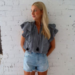 Sweet, but make it sharp. The Picnic Crush Gingham Top gives classic black-and-white gingham a modern twist with soft ruffle sleeves and a tie neckline that can go prim or playful.