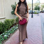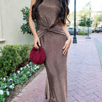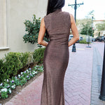 Sleek. Sculpted. Stunning. The Riana Dress in brown metallic brings effortless sophistication with its mock neckline, twist-front waist detail, and subtle shimmer that catches the light just right. Perfect for date nights, holiday parties, or any moment that deserves a little drama.