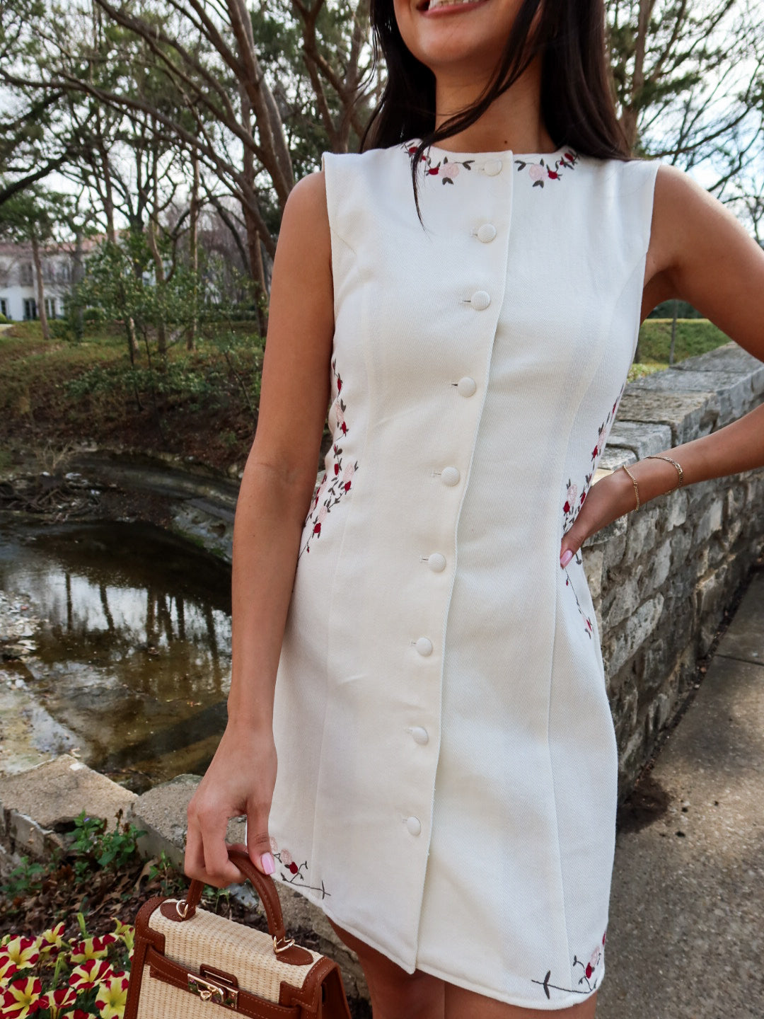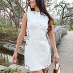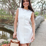 Crisp, playful, and effortlessly polished. The Brisbane Dress features structured white denim in a flattering mini silhouette, finished with red and green embroidered floral accents along the sides for the prettiest pop of color. The embroidery adds just enough detail to make it special, while the clean white base keeps it timeless.