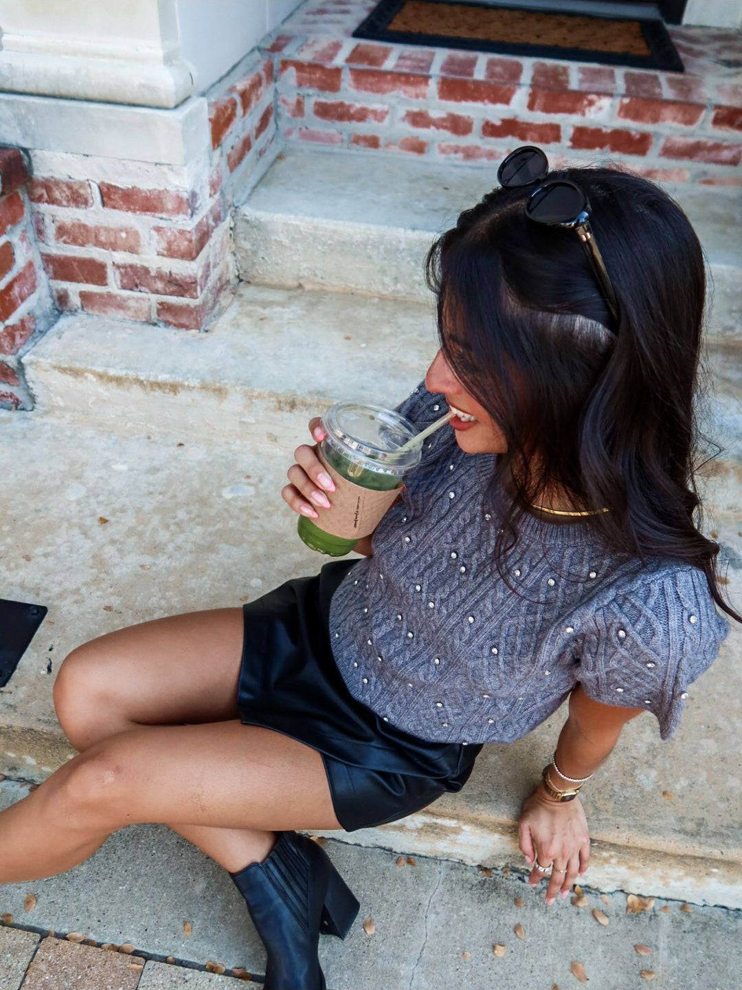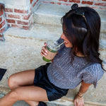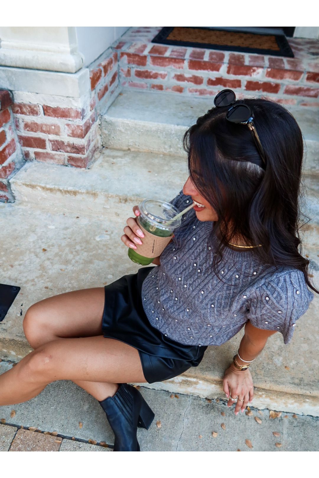 This one's giving casual sparkle with zero effort. The Shine On Sweater is a cropped short-sleeve knit in heathered grey, featuring a chunky braided texture and rhinestones scattered throughout for that just-right dose of glam. With its boxy fit and elevated details, it’s the perfect piece to throw on and still look like you tried.